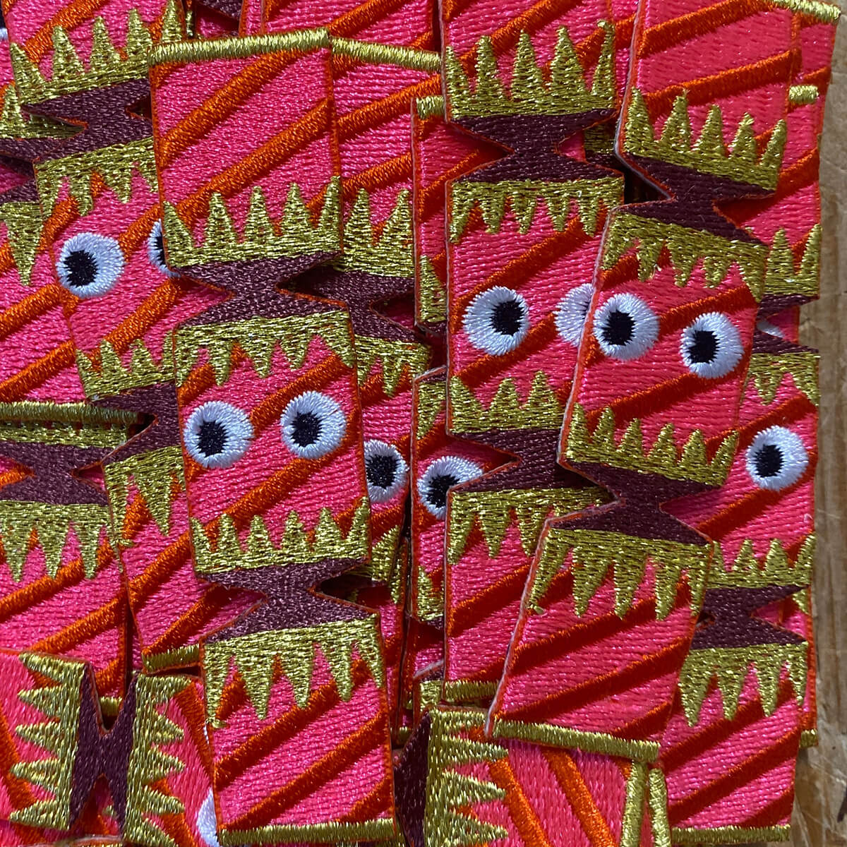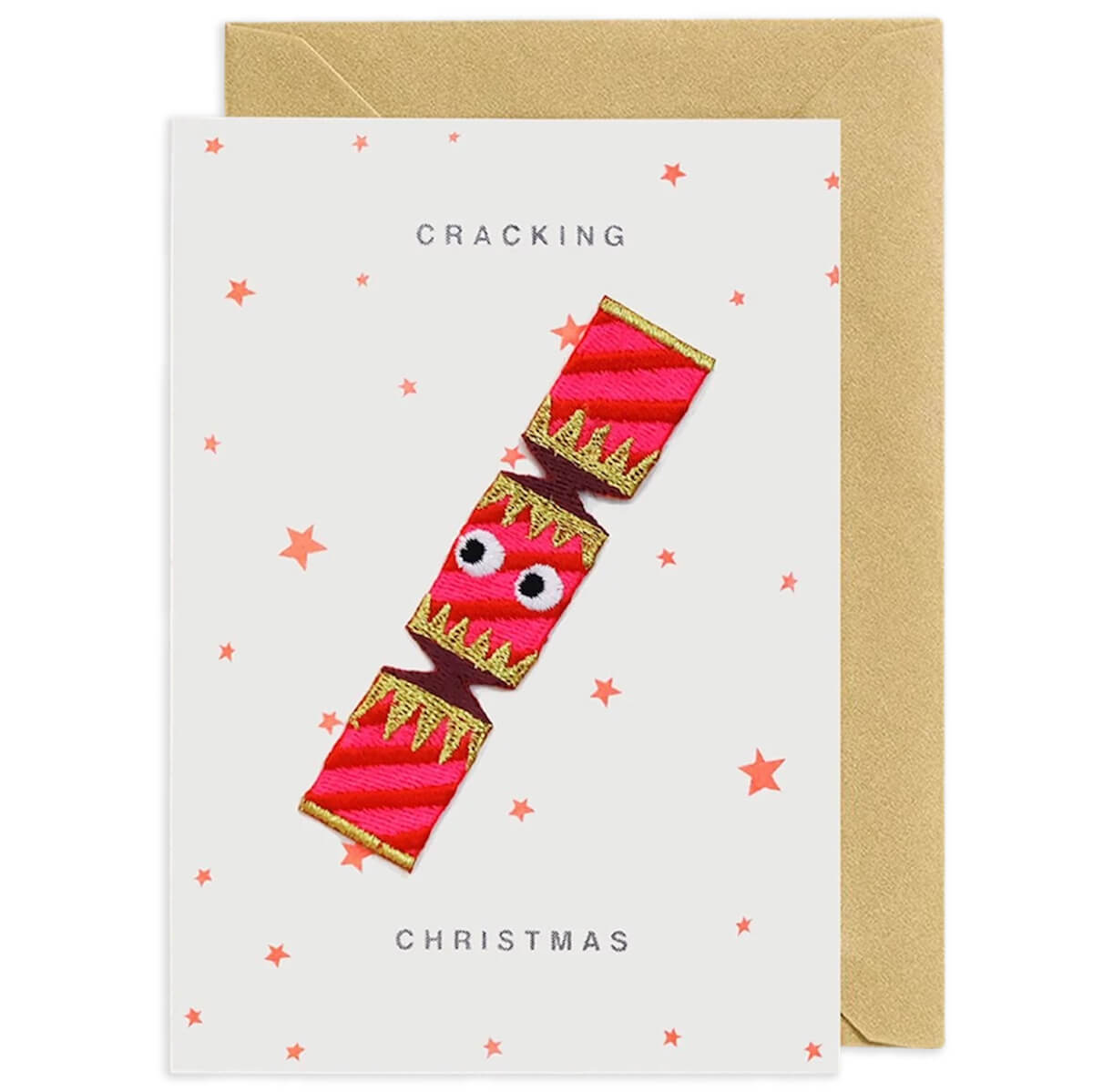 Christmas Cracker iron on patch Christmas card by Petra Boase.  Printed card featuring a richly embroidered colourful patch.  The patch has an iron-on backing so can be removed from the card and ironed on to a favourite t-shirt, rucksack or whatever you like! The card is printed using Risograph digital screen printing techniques and soy based fluorescent inks. Cracking Christmas message on the front. Blank inside for your own message.