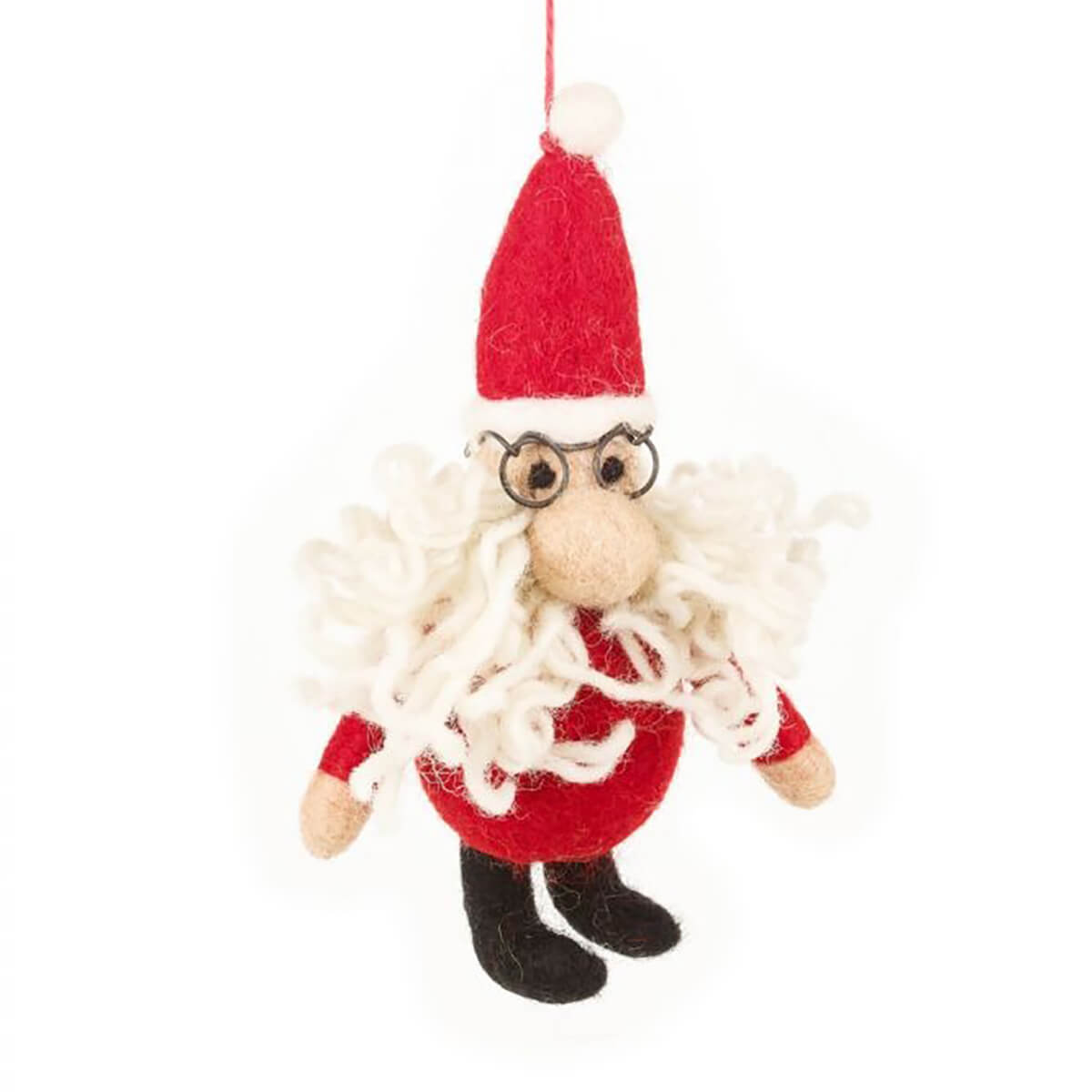 Curly Santa hanging Christmas decoration by Felt So Good. A festive Santa with curly hair and wire glasses. Gorgeous hand felted Santa hanging tree decoration with hand stitched detailing.