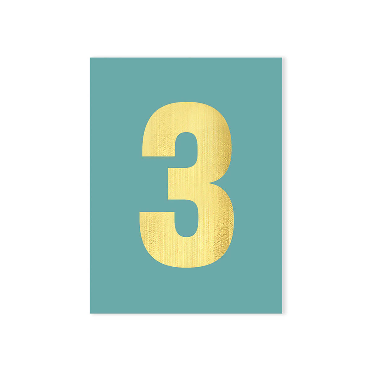 Age 3 Birthday Greetings Card by Kali Stileman Cards. A gloriously golden number one card! This mini card is perfect for little people’s birthdays or anniversaries alike. Set on a soft turquoise background.