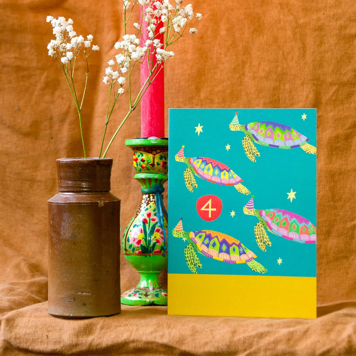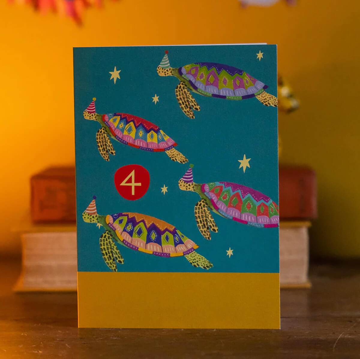 Age 4 Party Turtles Birthday Greetings Card by Hutch Cassidy. Ensure they have a turtle-y great birthday with this whimsical 4th birthday card. Featuring fantastical, party hat wearing, sea turtles this card is sure to bring delight to its recipient.