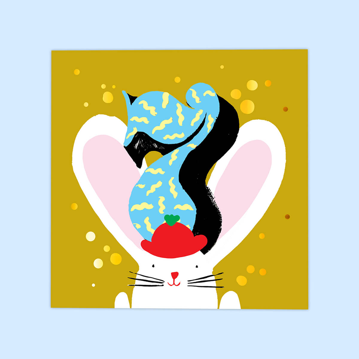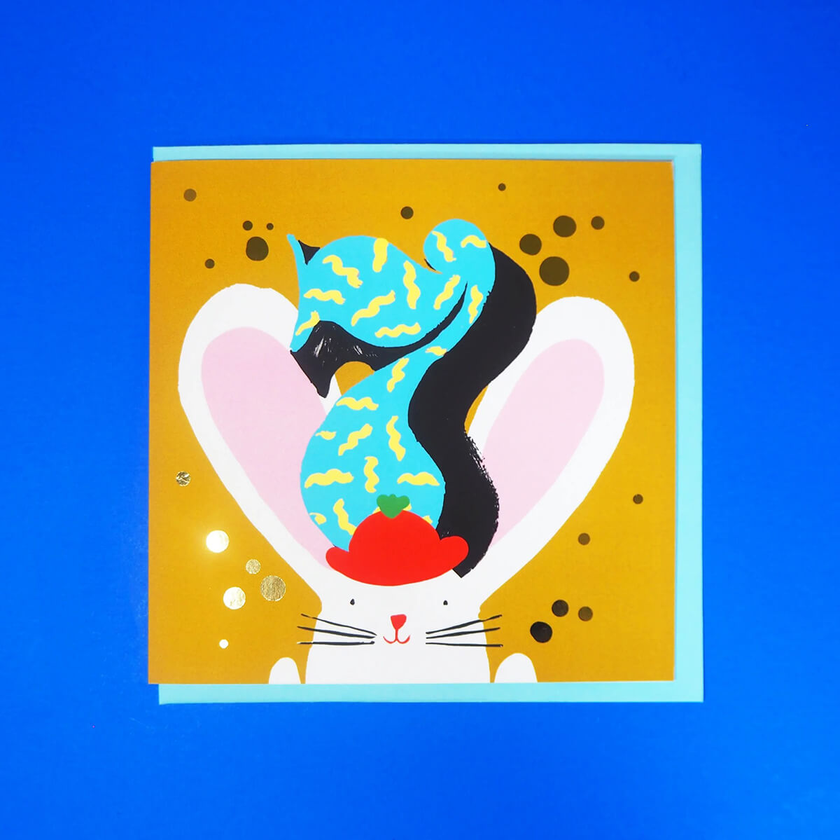 Age 7 birthday greetings card by Eleanor Bowmer. Cute bunny themed 'Age 7 Card' with gold foiling details. Features an illustration by Eleanor Bowmer. Made from premium card stock with a luxurious silk texture and gold foil printed details. Blank inside for your own message.