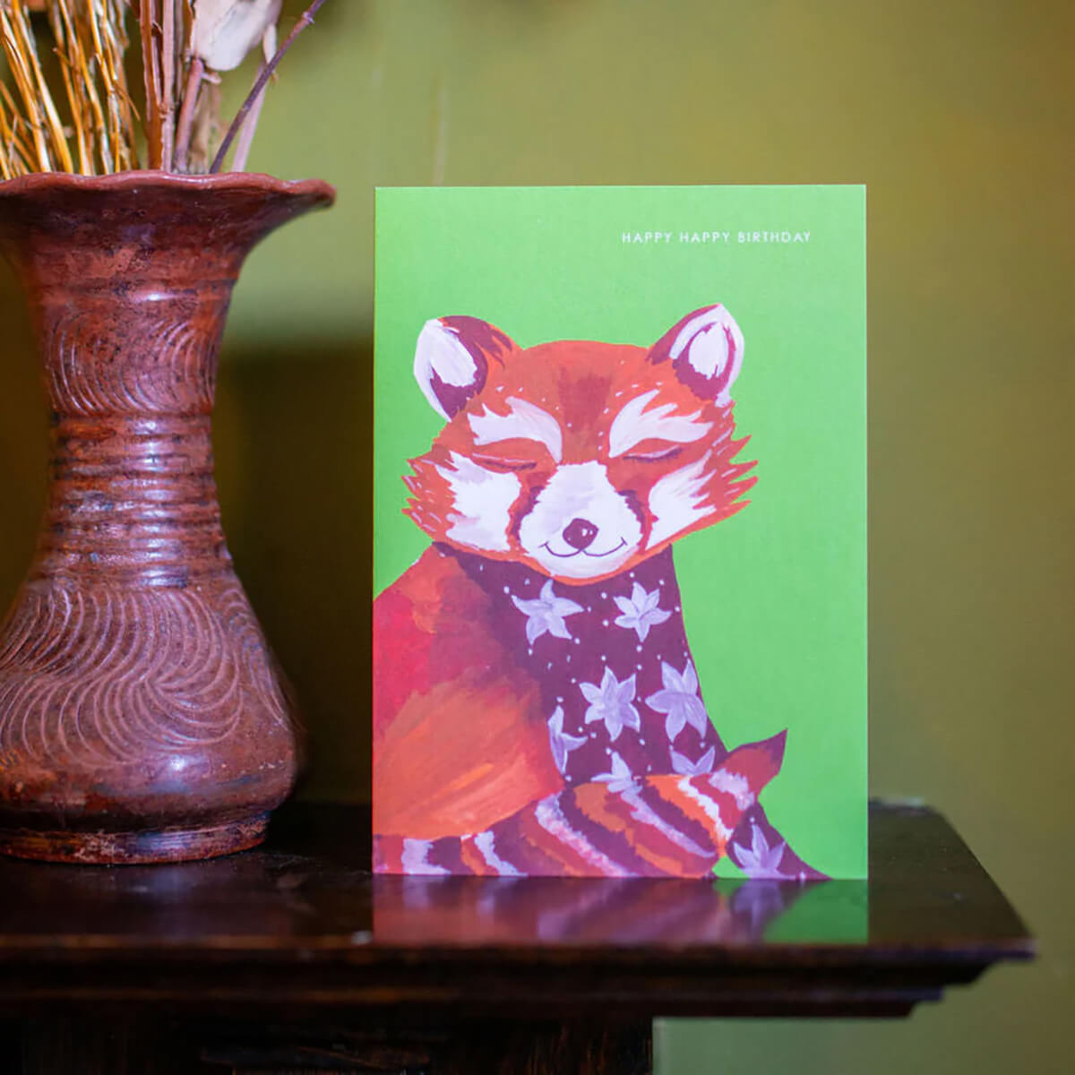 Decorative Red Panda Birthday Greetings Card by Hutch Cassidy. Featuring an adorable red panda alongside the message 'Happy Happy Birthday' this card is designed to delight. Left blank inside so that you can include your own personal message to the lucky recipient.