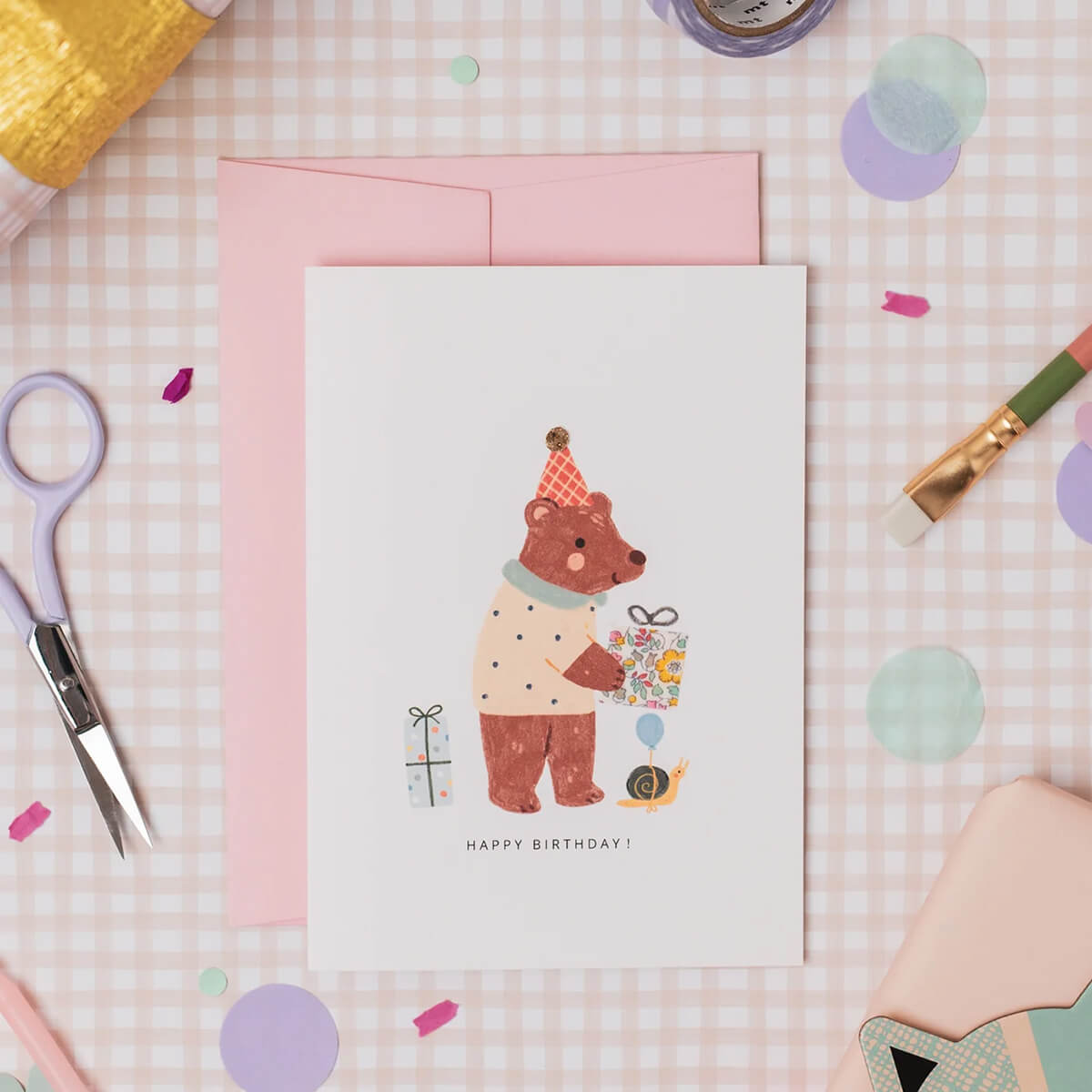 Liberty Bear Birthday Greetings Card in Katie & Millie Liberty Print by The Charming Press. A beautiful hand finished card featuring a little bear carrying a Liberty fabric present and a golden glittery bobble on top of her party hat. Happy Birthday message on the front. Made with Liberty tana cotton lawn and biodegradable glitter details. Blank inside for your own message. Pale pink envelope.