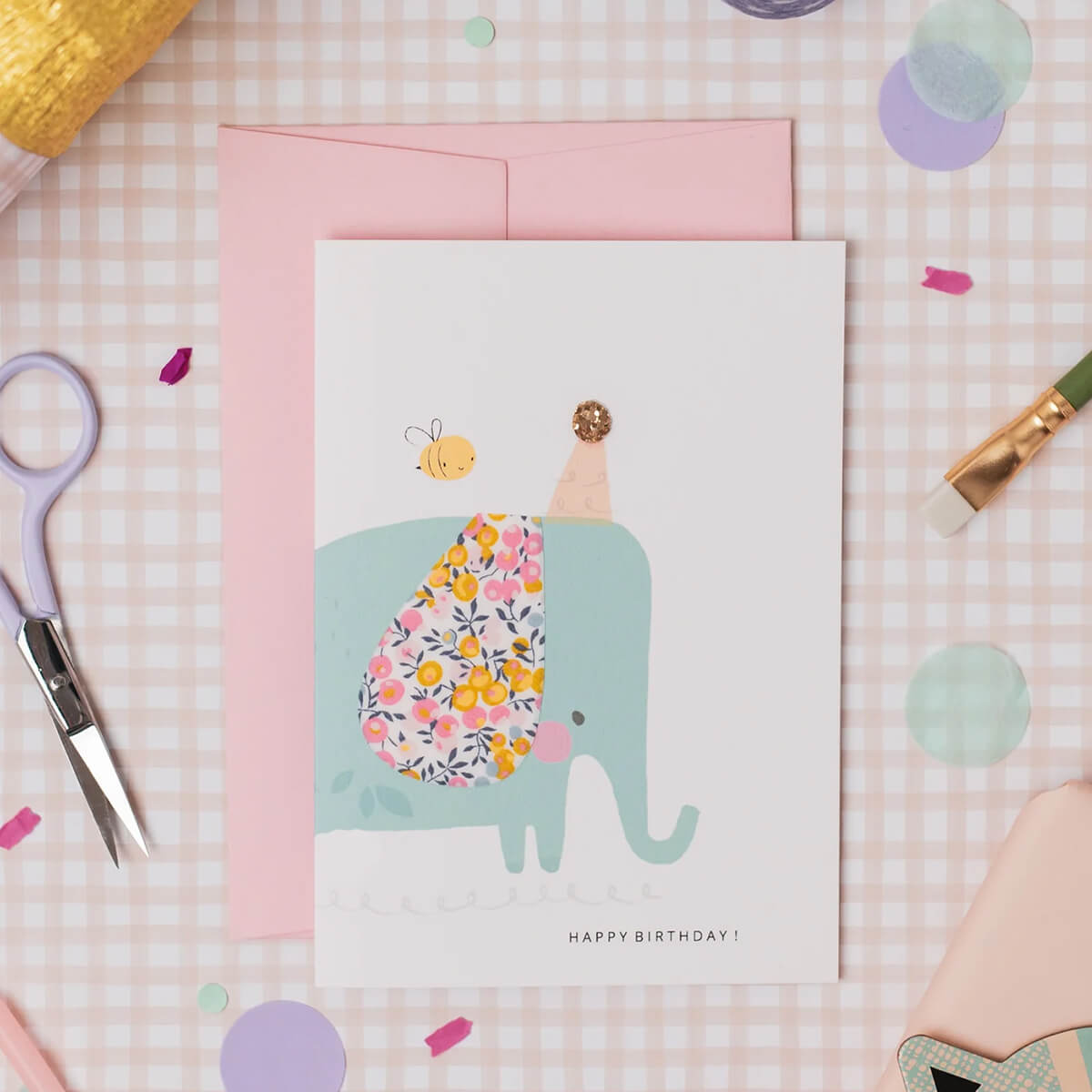 Liberty Elephant Birthday Greetings Card in Wiltshire Bud Liberty Print by The Charming Press. A beautiful hand finished card featuring a fun elephant with a Liberty print ear and a golden glittery bobble on top of her party hat. Happy Birthday message on the front. Made with Liberty tana cotton lawn and biodegradable glitter details. Blank inside for your own message. Pale pink envelope.