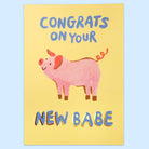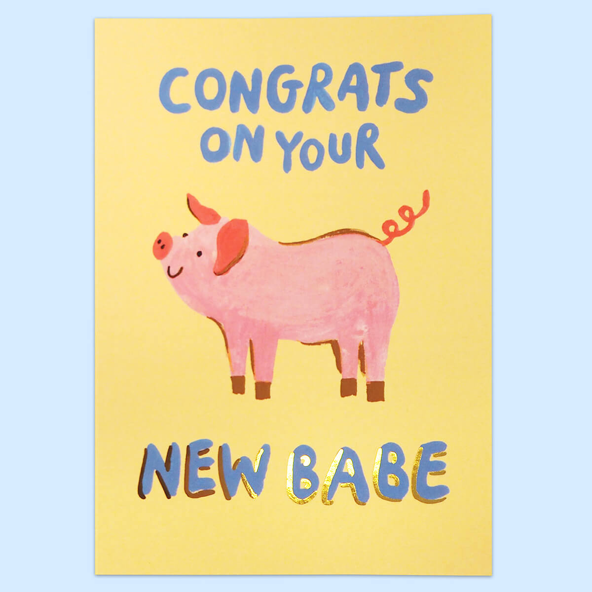 New Babe baby greetings card by Eleanor Bowmer. This adorable card features a hand painted pig with a yellow background. Surrounding the pig is blue writing with foiled detail that says 'Congrats On Your New Babe'. The perfect card to welcome a special baby into the world! Features an illustration by Eleanor Bowmer. Made from premium card stock with a luxurious silk texture and gold foil printed details. Blank inside for your own message.