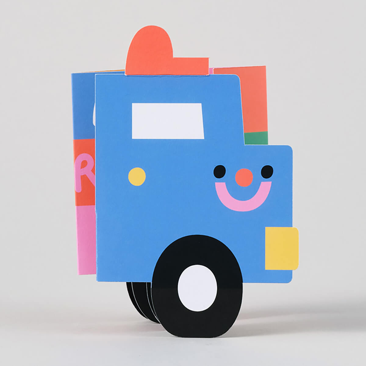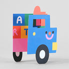 Truck fold out birthday greetings card by Susie Hammer for Wrap. This birthday card is a truck load of fun! Designed by Susie Hammer in her signature simple shapes and vivid colour. Includes a lined section on the reverse of the card to write your message on. Yellow envelope included.