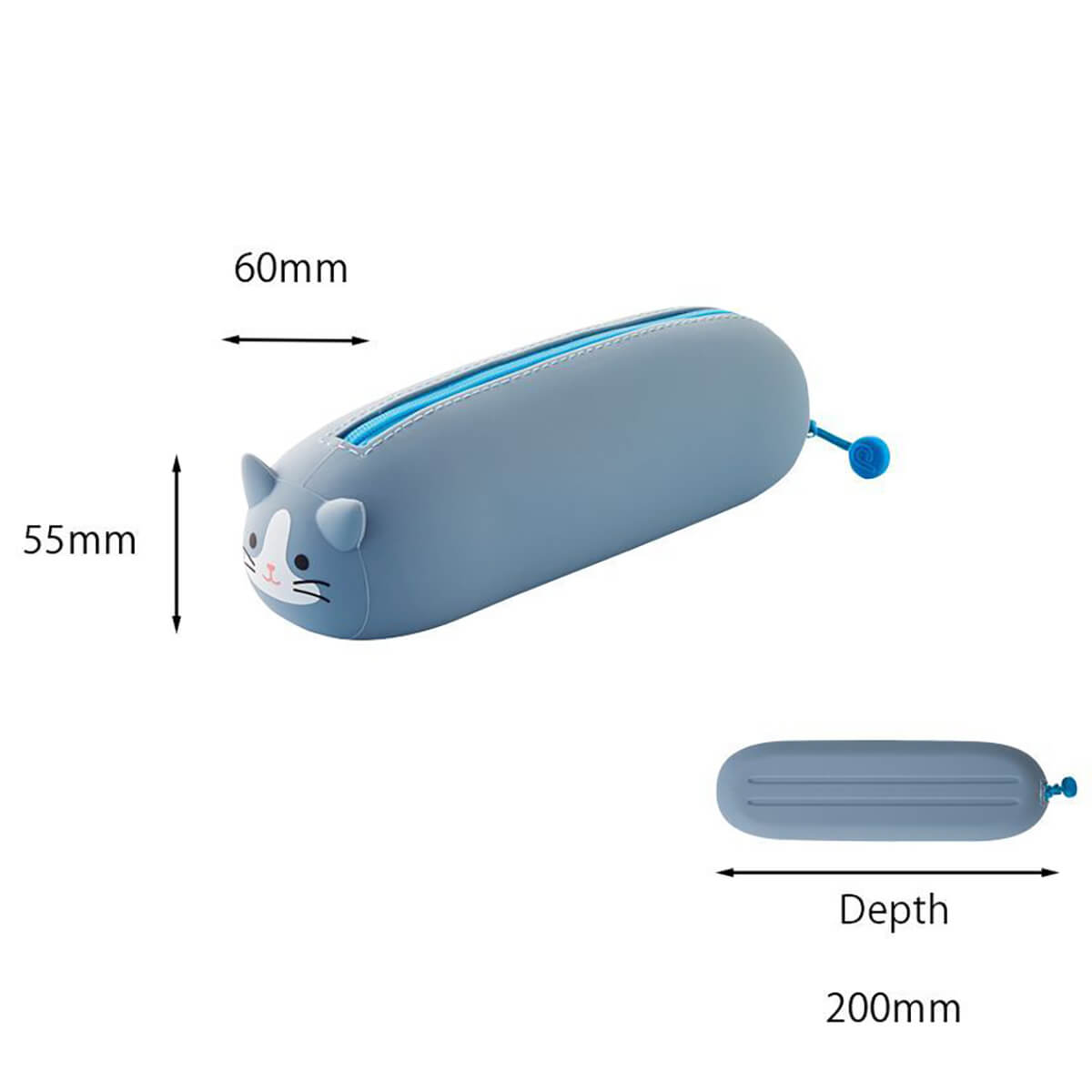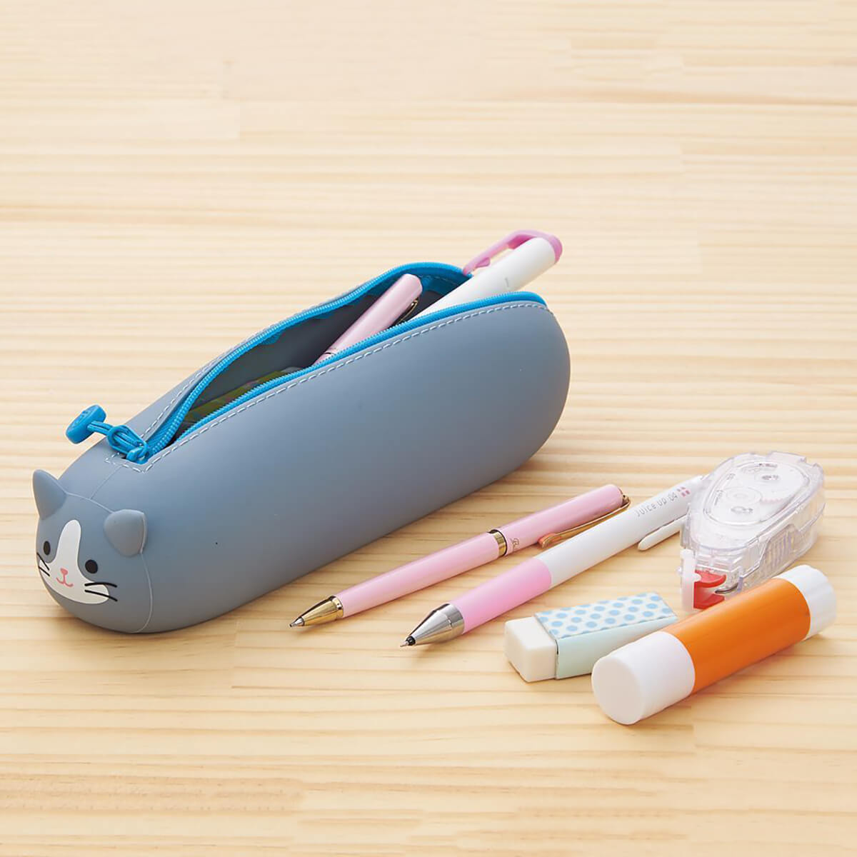 Grey Tuxedo Cat PuniLabo Lying Pen Pouch by Lihit Lab. This super cute kitty has a flat base with ridges, ensuring the zipper opening is always on top and the case doesn't roll away. In soft touch silicone with a brightly coloured zipper fastening. The zipper opens all the way around the back for easy access to everything inside. The pen pouch is a great desk accessory and is also super portable. Holds up to 14 pens depending on their thickness. Made from a tactile, suede-feel silicone for a luxurious touch.