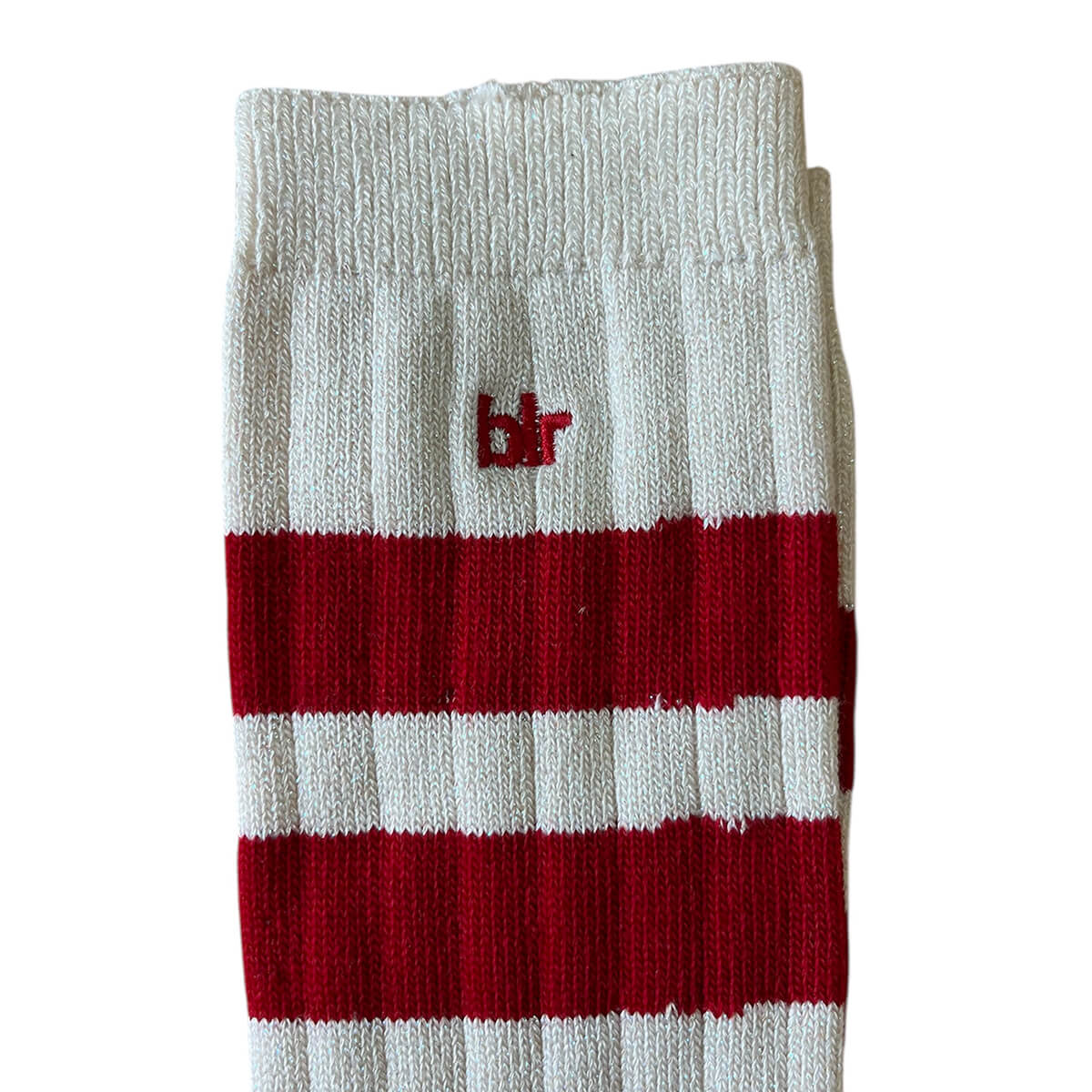Bure Crew Socks by Bellerose. Crew socks in sparkly ecru made from a rib-knit cotton blend with contrasting ankle stripes, toes, and heels in printed yarn.
