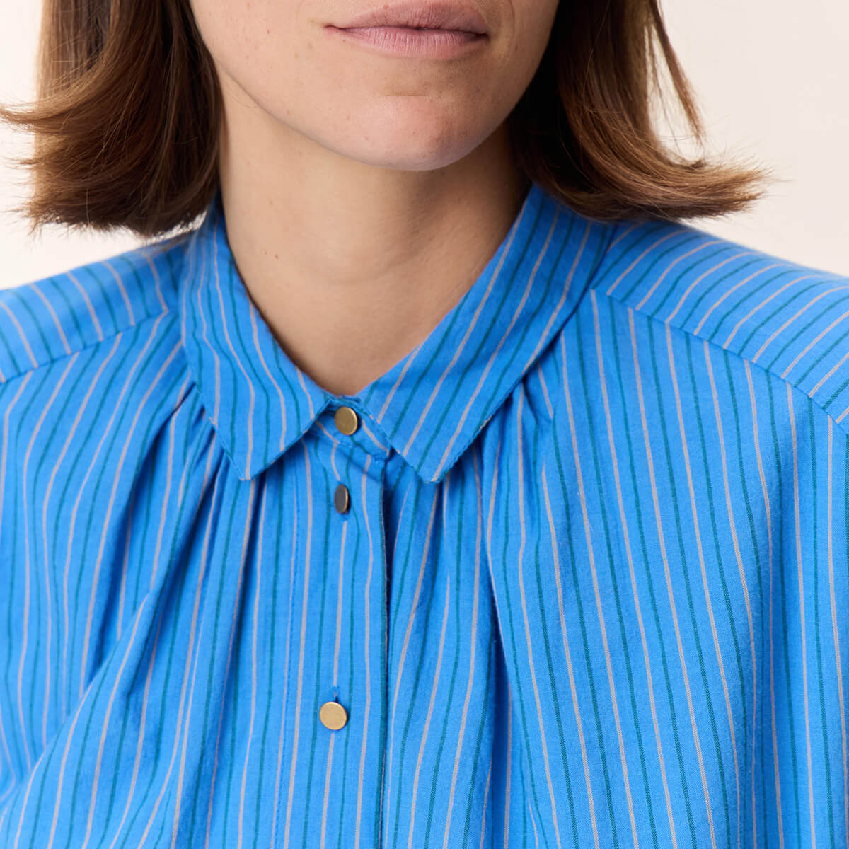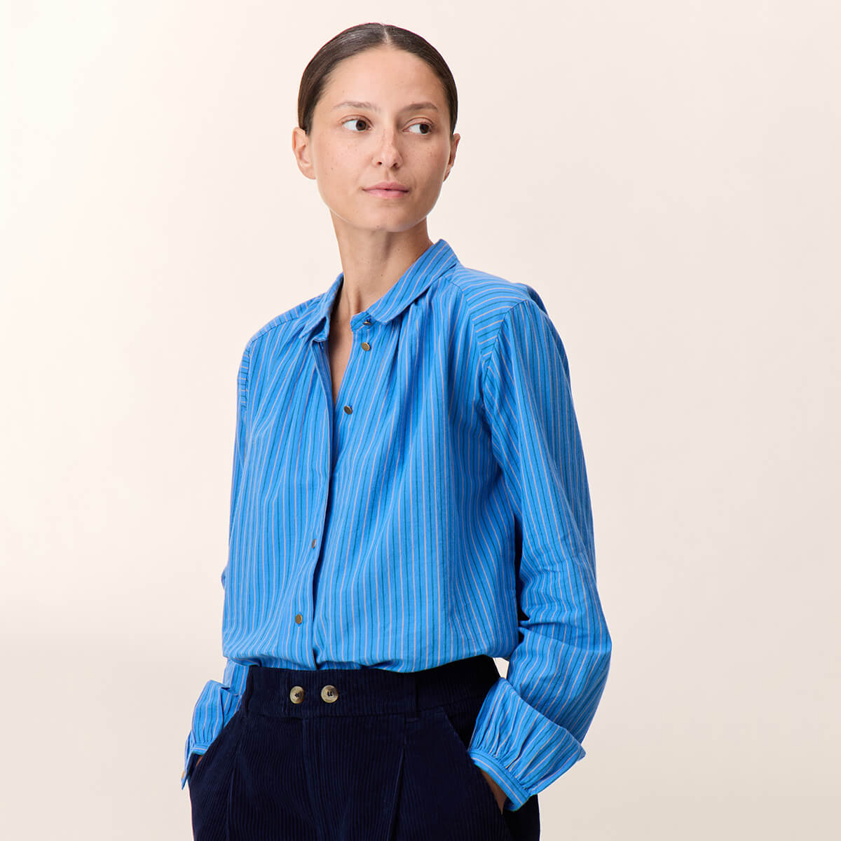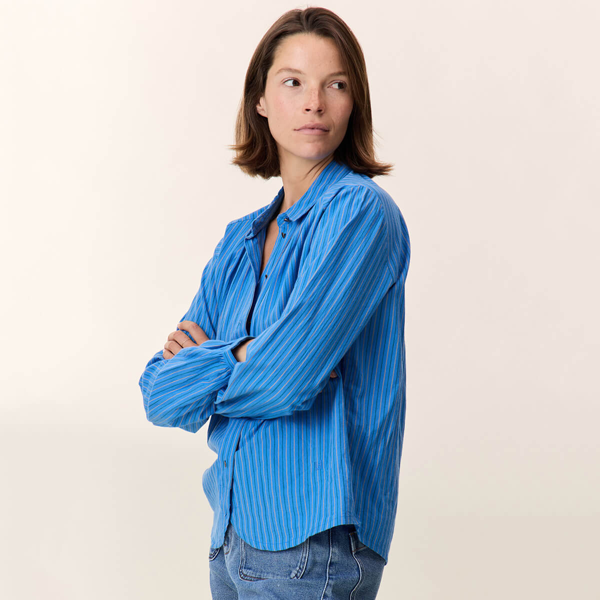 Cob Shirt by Leon & Harper. The Cob Stripe shirt by Leon & Harper features a loose fit with a fluid drape, designed for a free and relaxed look. Its vertical stripe pattern energizes the silhouette, while the shirt collar and button placket, accented with small round buttons, add character. Ease pleats at the shoulders provide volume, and the long sleeves end with buttoned cuffs. The rounded hem is perfect for all style desires.