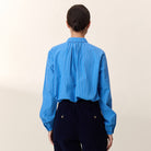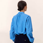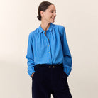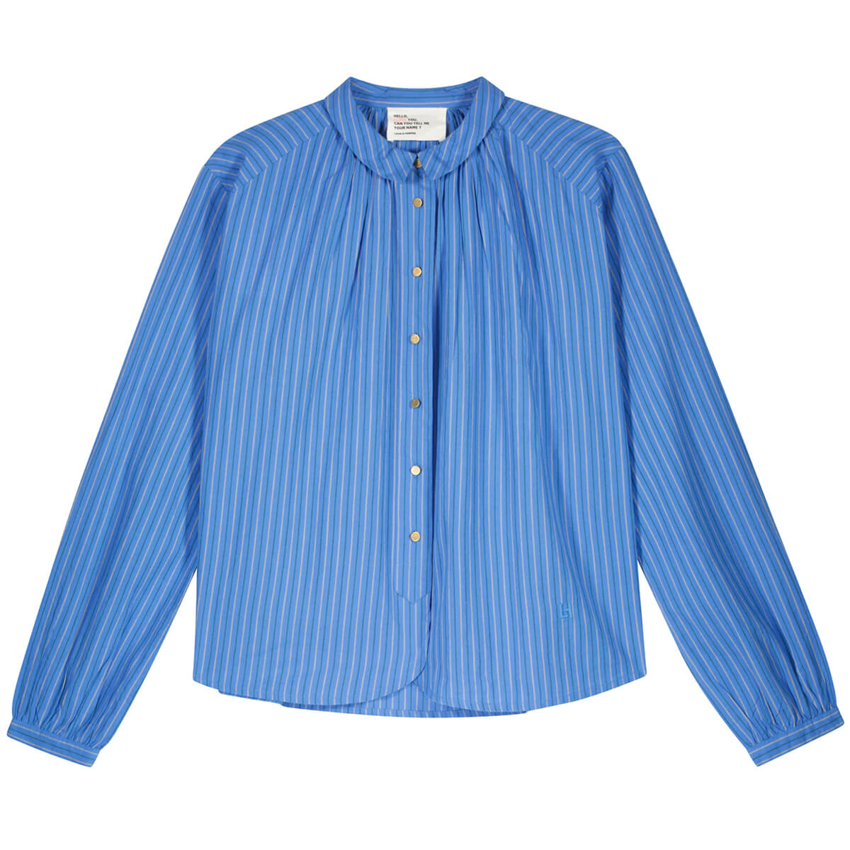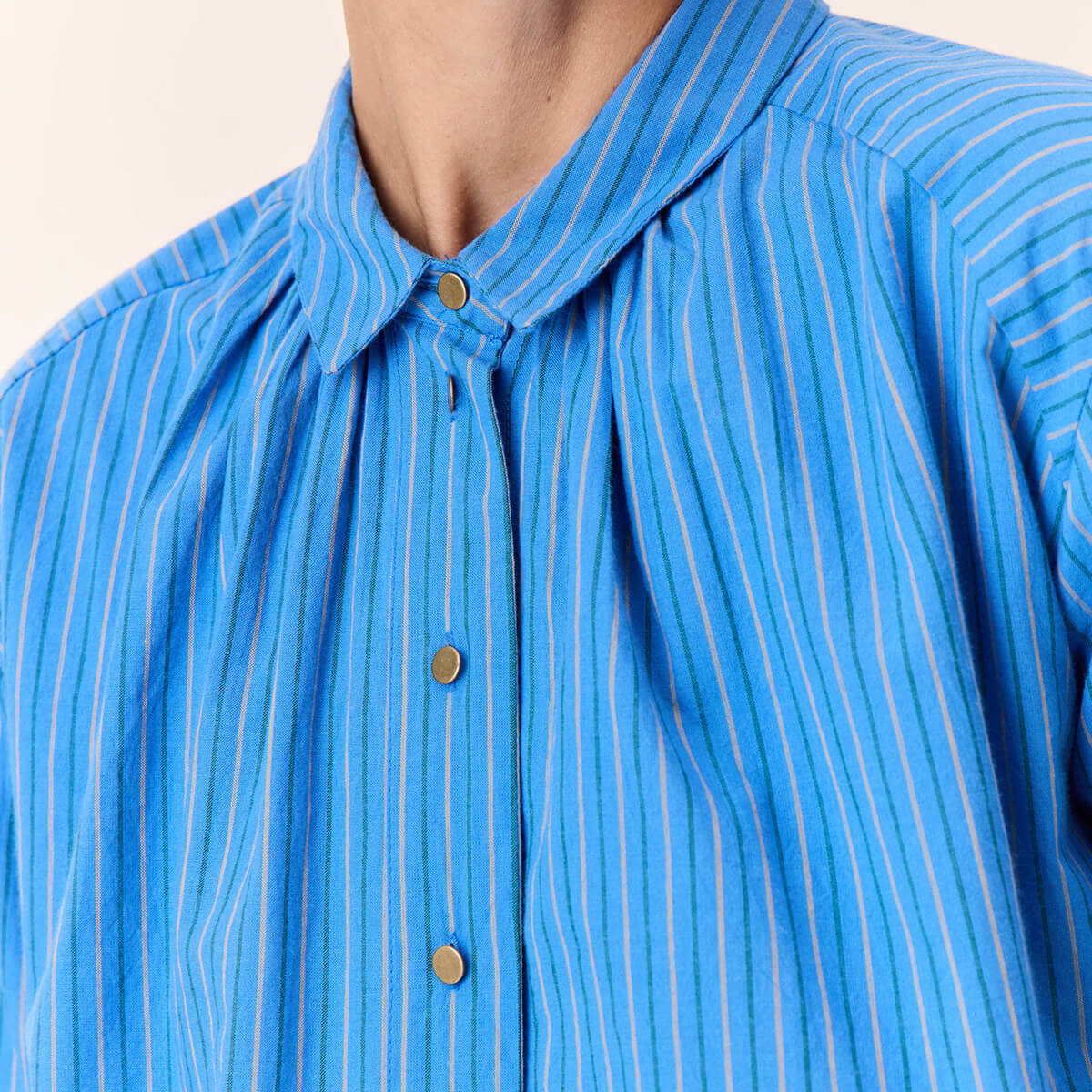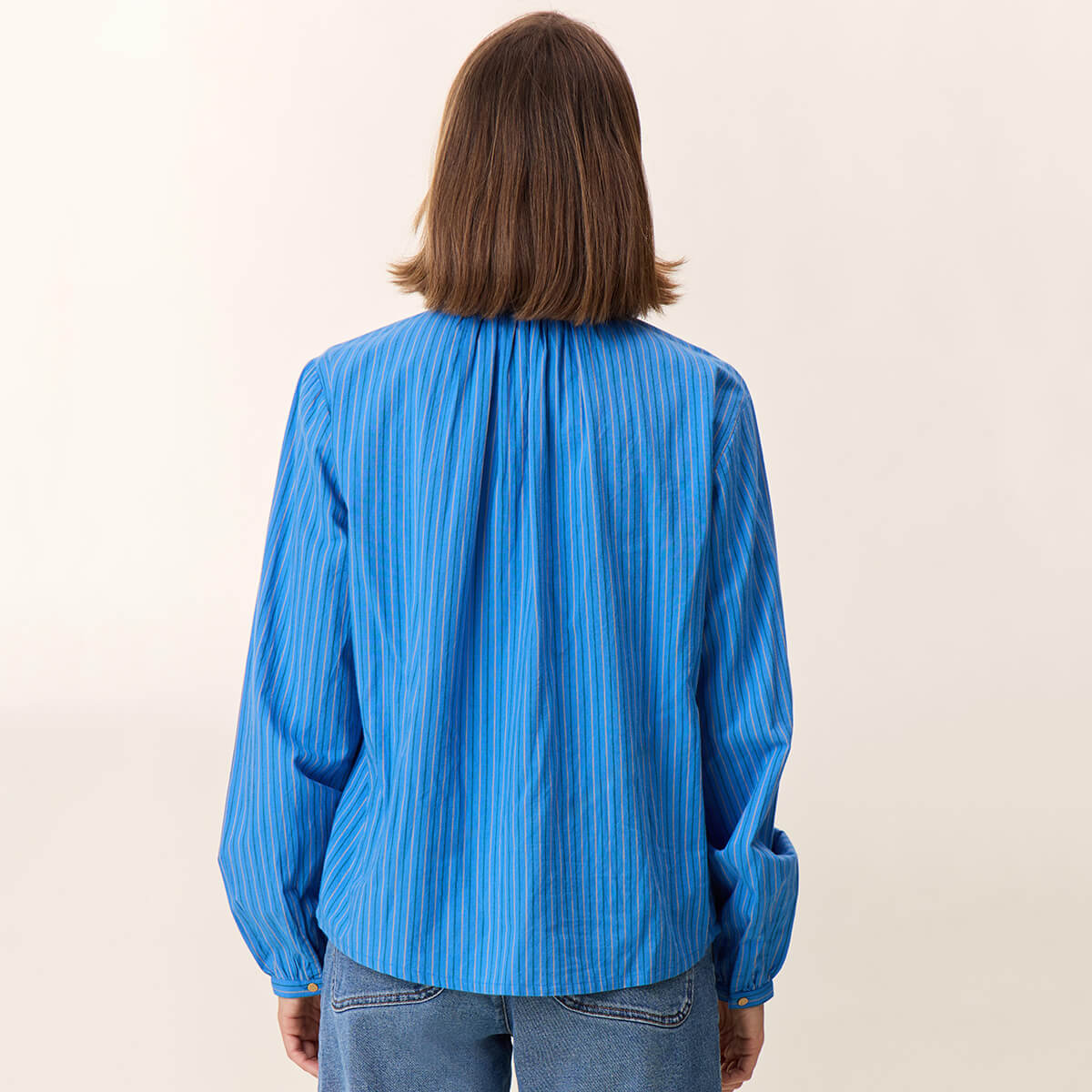 Cob Shirt by Leon & Harper. The Cob Stripe shirt by Leon & Harper features a loose fit with a fluid drape, designed for a free and relaxed look. Its vertical stripe pattern energizes the silhouette, while the shirt collar and button placket, accented with small round buttons, add character. Ease pleats at the shoulders provide volume, and the long sleeves end with buttoned cuffs. The rounded hem is perfect for all style desires.