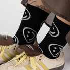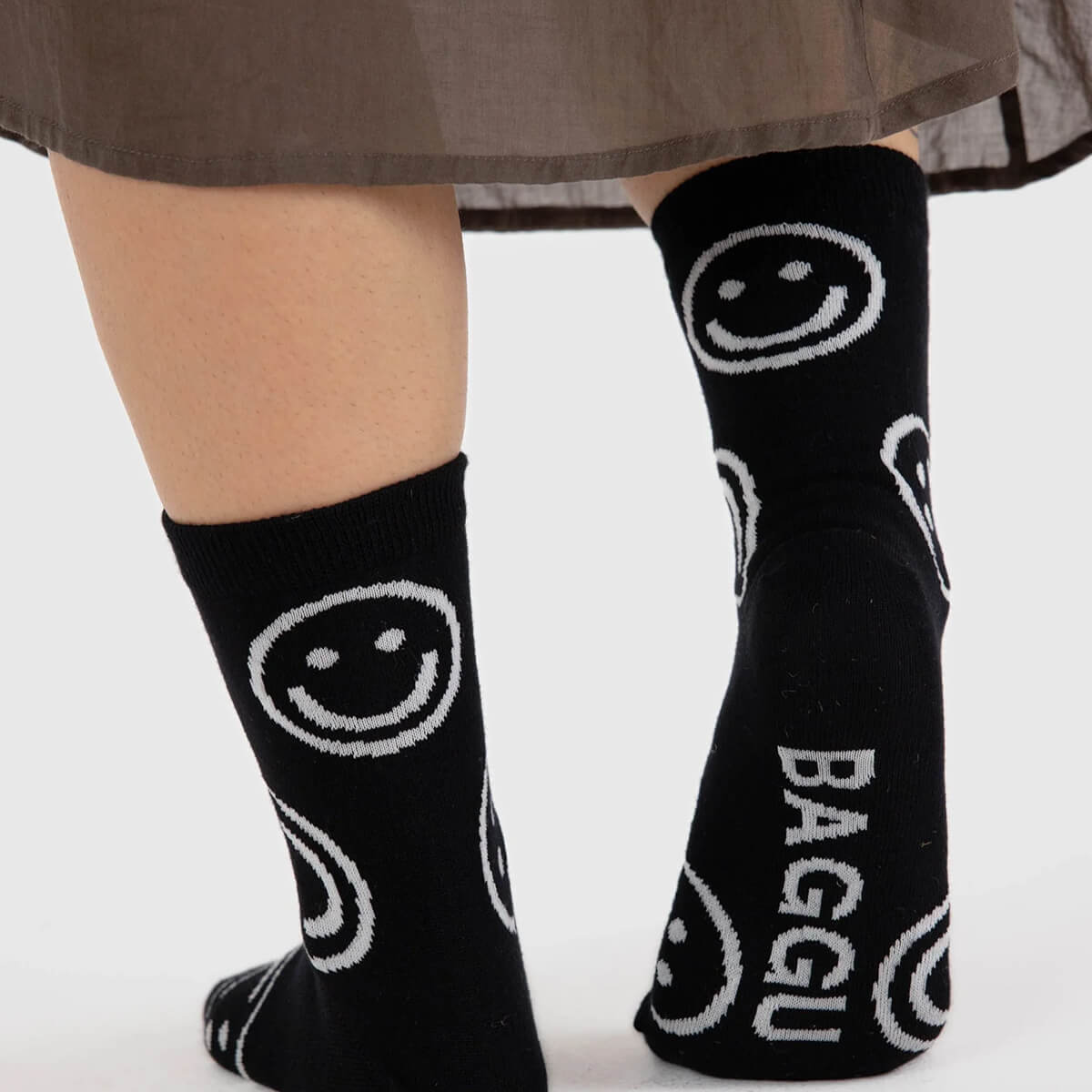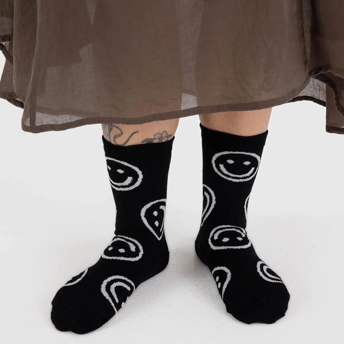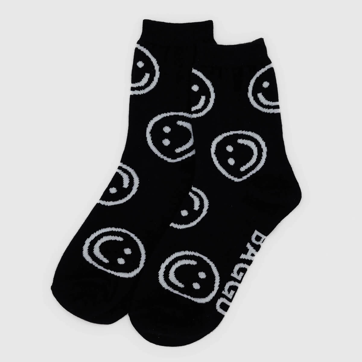 Crew socks with an all over Happy intarsia knit pattern by Baggu. These crew socks are woven from soft and stretchy bamboo rayon — a real treat for your feet.