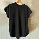 Ease Tee by Le Bon Shoppe. The Ease Tee is an edgy dolman tee. It features a high crew neck, shoulder coverage without a sleeve, slightly rounded hem and a contrast rib banded sleeve opening and neck opening. With a crisp colour palette and enough length to tuck in or out this is the perfect piece for a cool girl's uniform.