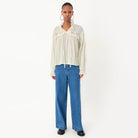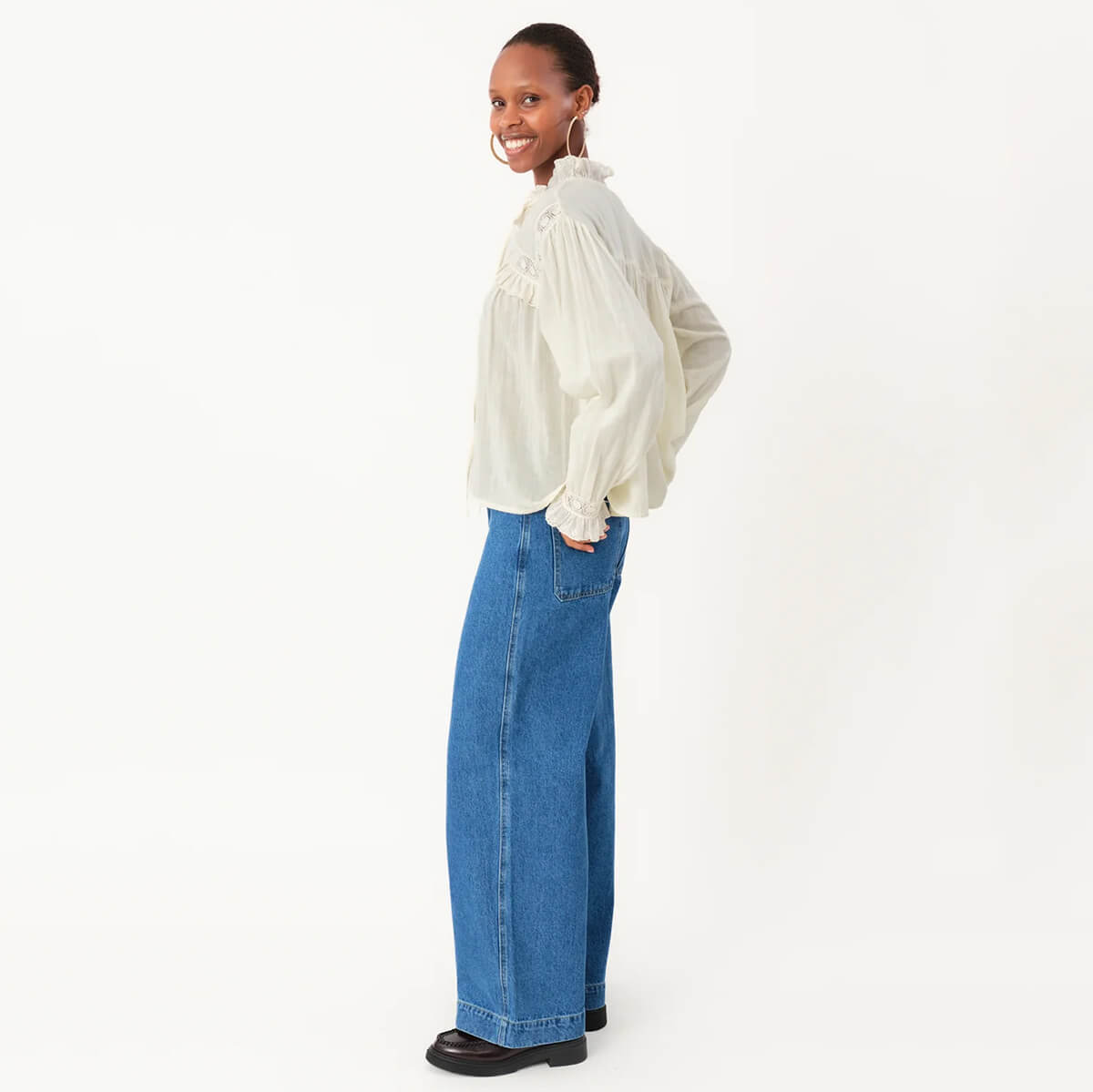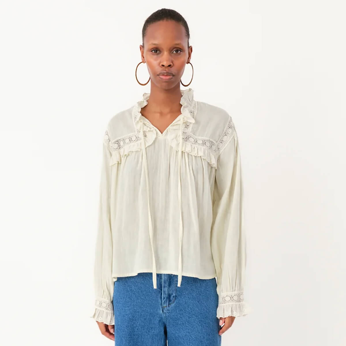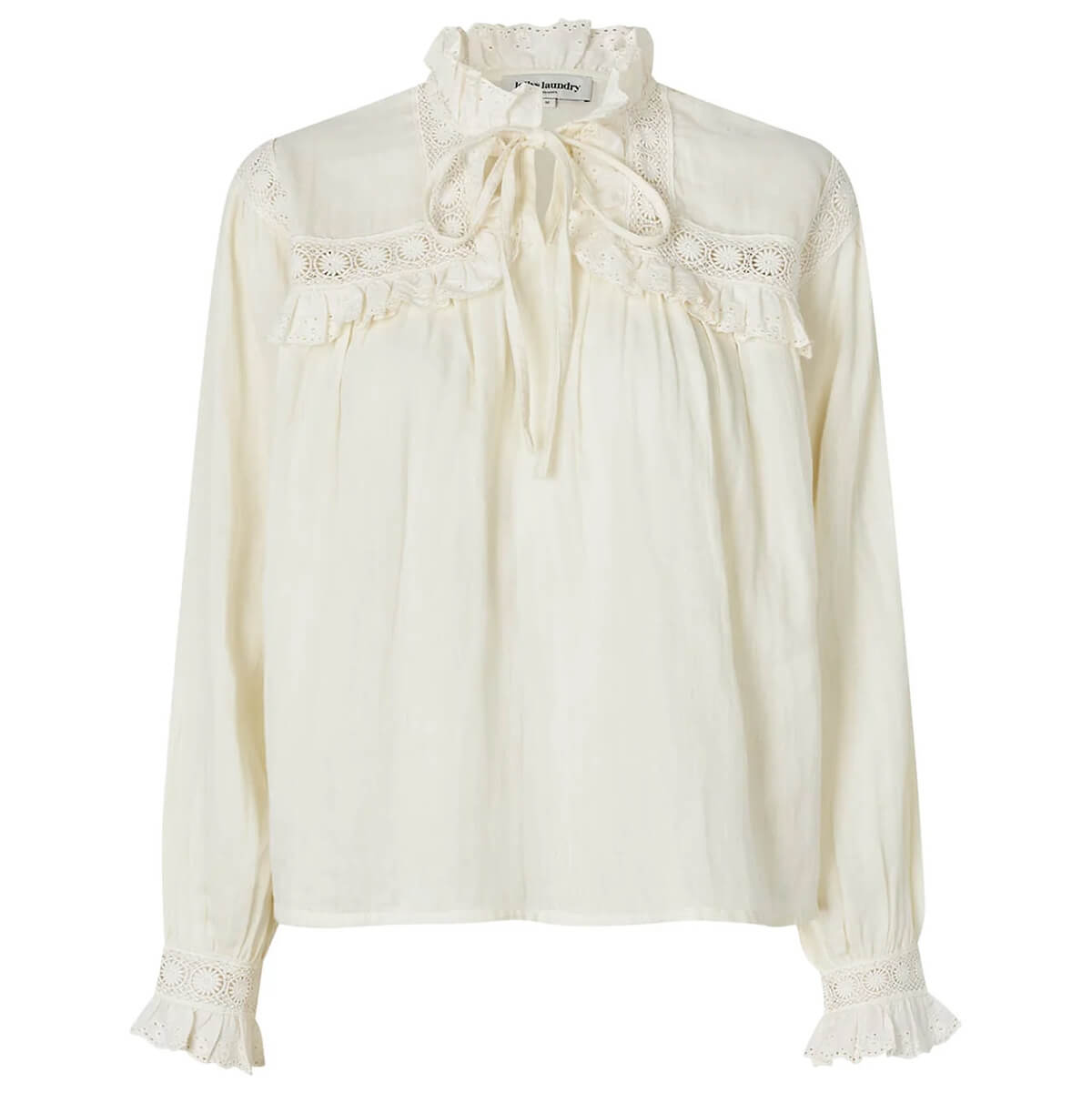 Gemma Shirt by Lollys Laundry. The Gemma shirt is a new romantic style in the Lollys universe, designed with feminine details and an elegant vintage touch. Made from 100% viscose, it feels light and comfortable to wear. The top part features a decorative yoke with soft ruffles, framed by a delicate lace ribbon. The sleeves are long with a gentle volume and finish in wide cuffs with fine pleats, broderie anglaise and the same lace trim – all ending in a romantic ruffle. The high neckline is softly gathered and ties with a bow, giving you styling flexibility.