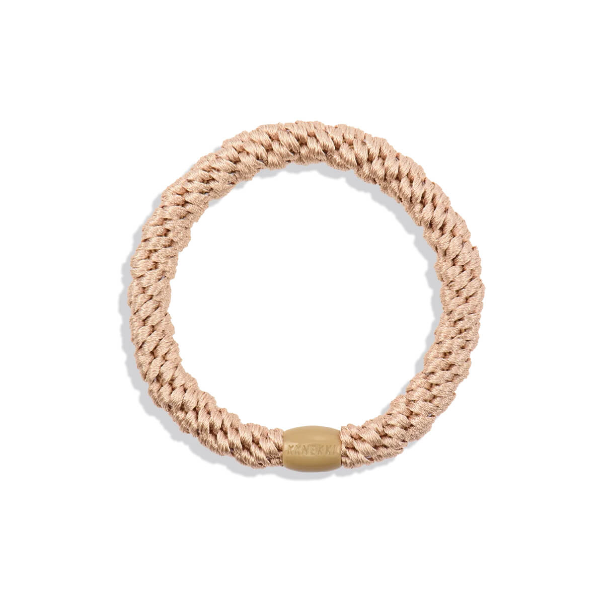 Kknekki snag free hair band by Bon Dep. The best hair ties ever made! The plastic bead and braiding ensures that it doesn't damage the hair. The hair band will also keep its shape when used.  And it also looks great worn as a bracelet too.