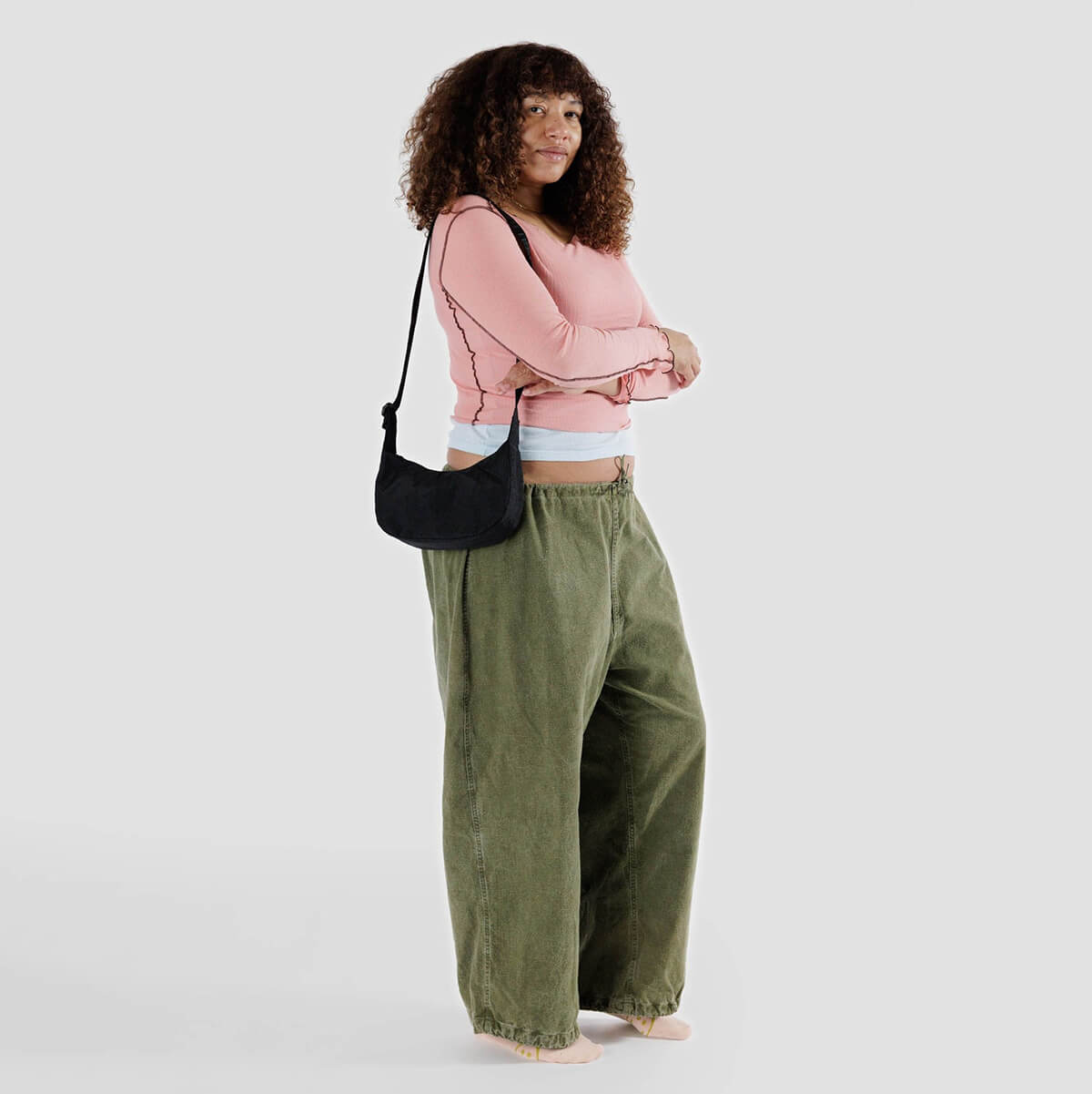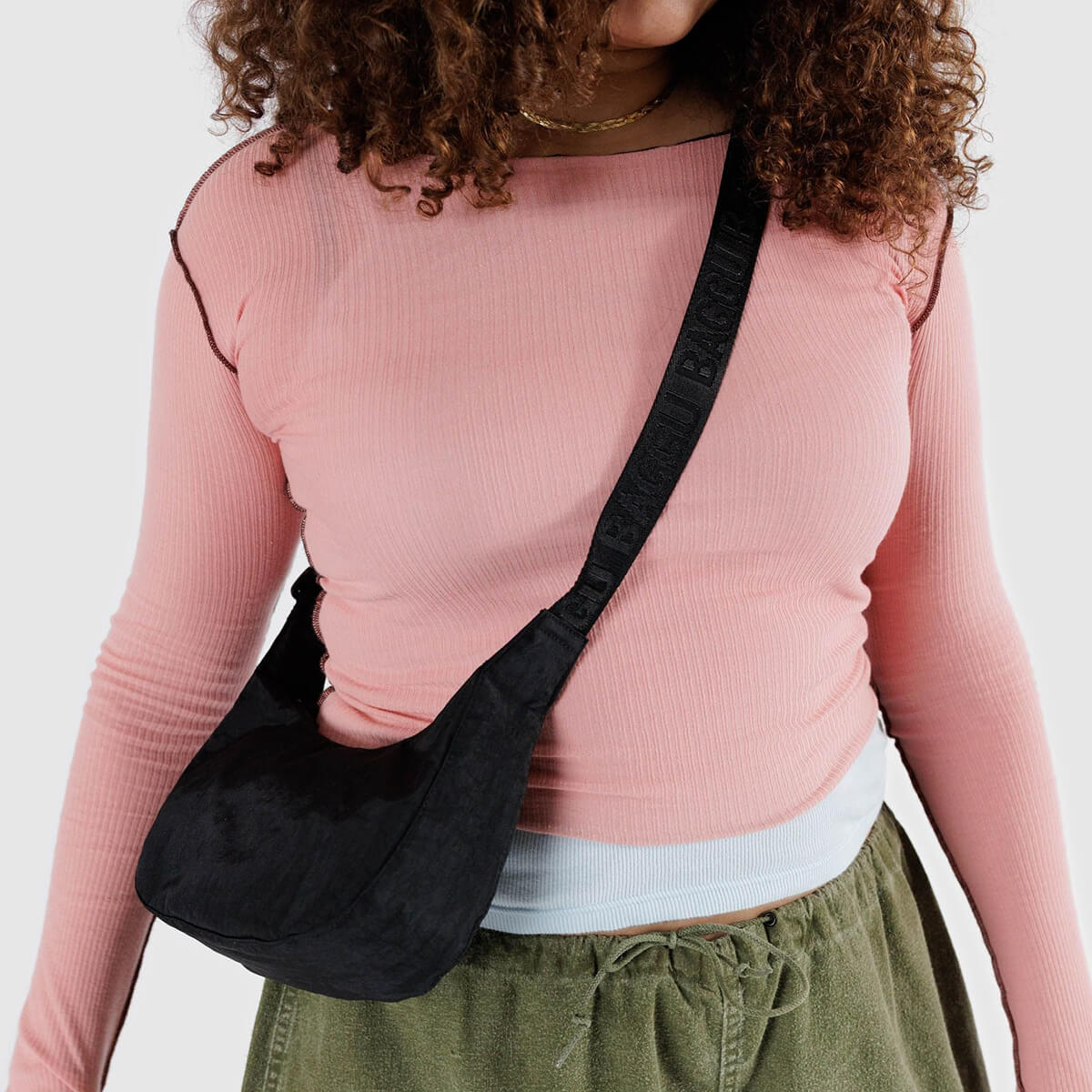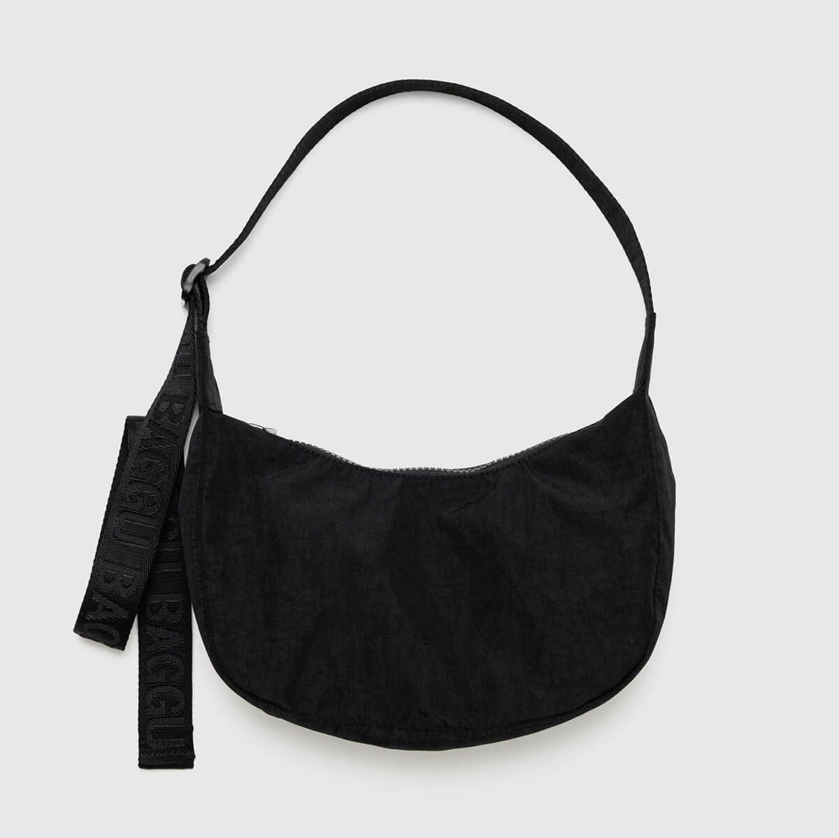 Small Nylon Crescent Bag by Baggu. Smaller size version of the popular Baggu crescent bag that is still roomy enough for keys, a wallet, book and phone. Wear it slung over your shoulder or crossbody for a hands-free experience. Complete with an interior zip pocket that make it easy to stay organised.