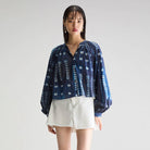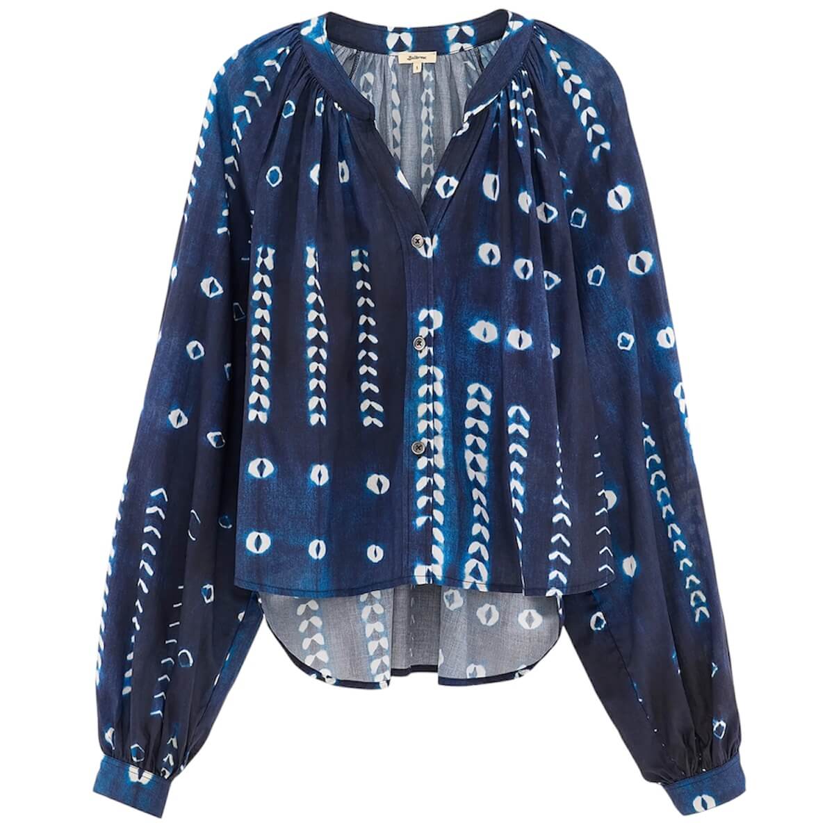 Tonka Blouse by Bellerose. Regular fit blouse with a tunisian neckline and balloon sleeves with fitted cuffs, made from shirobi print cotton in indigo
