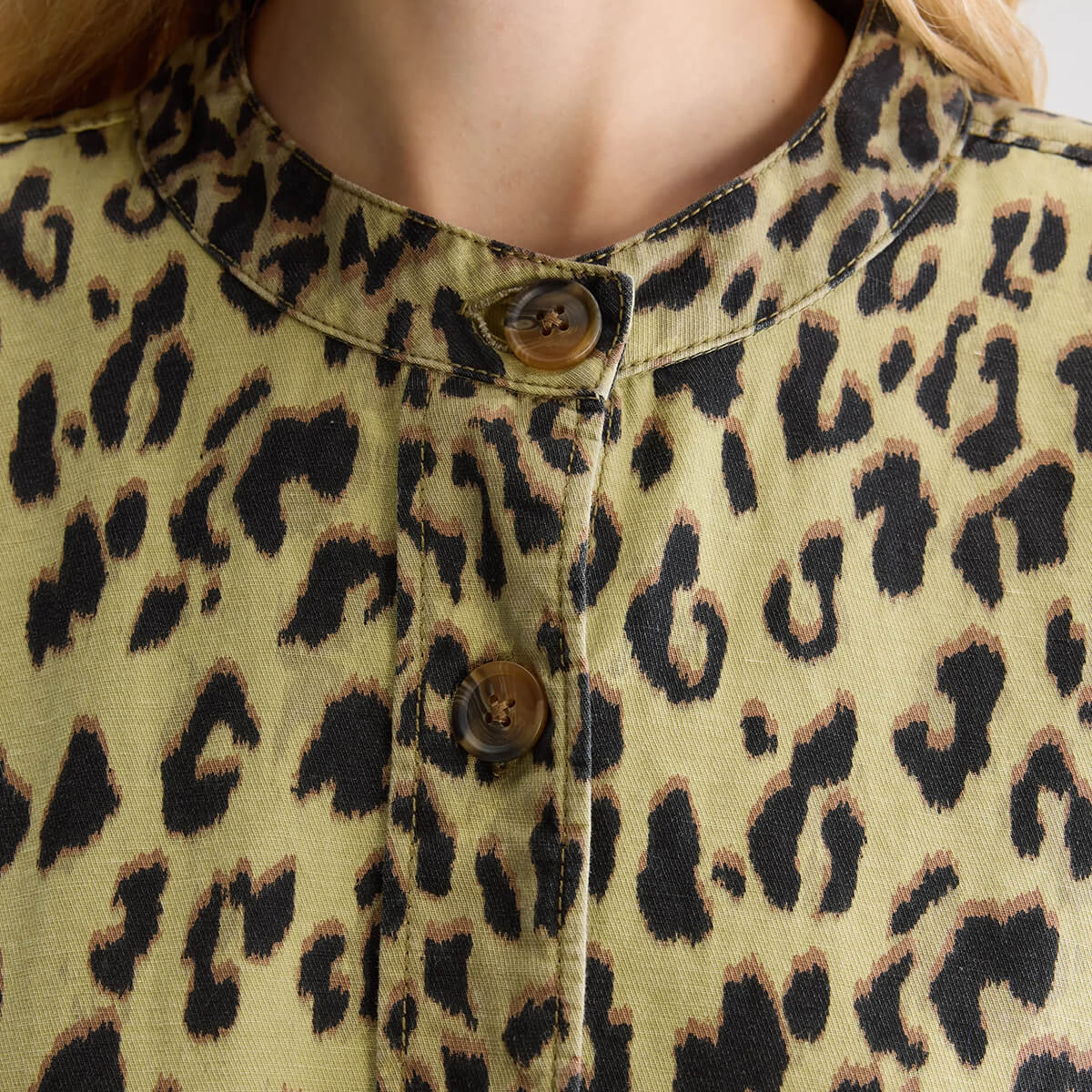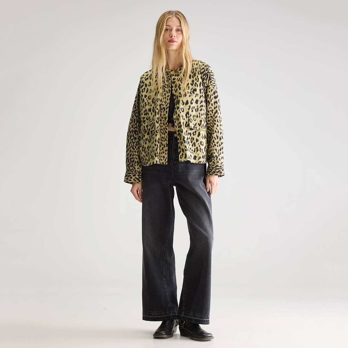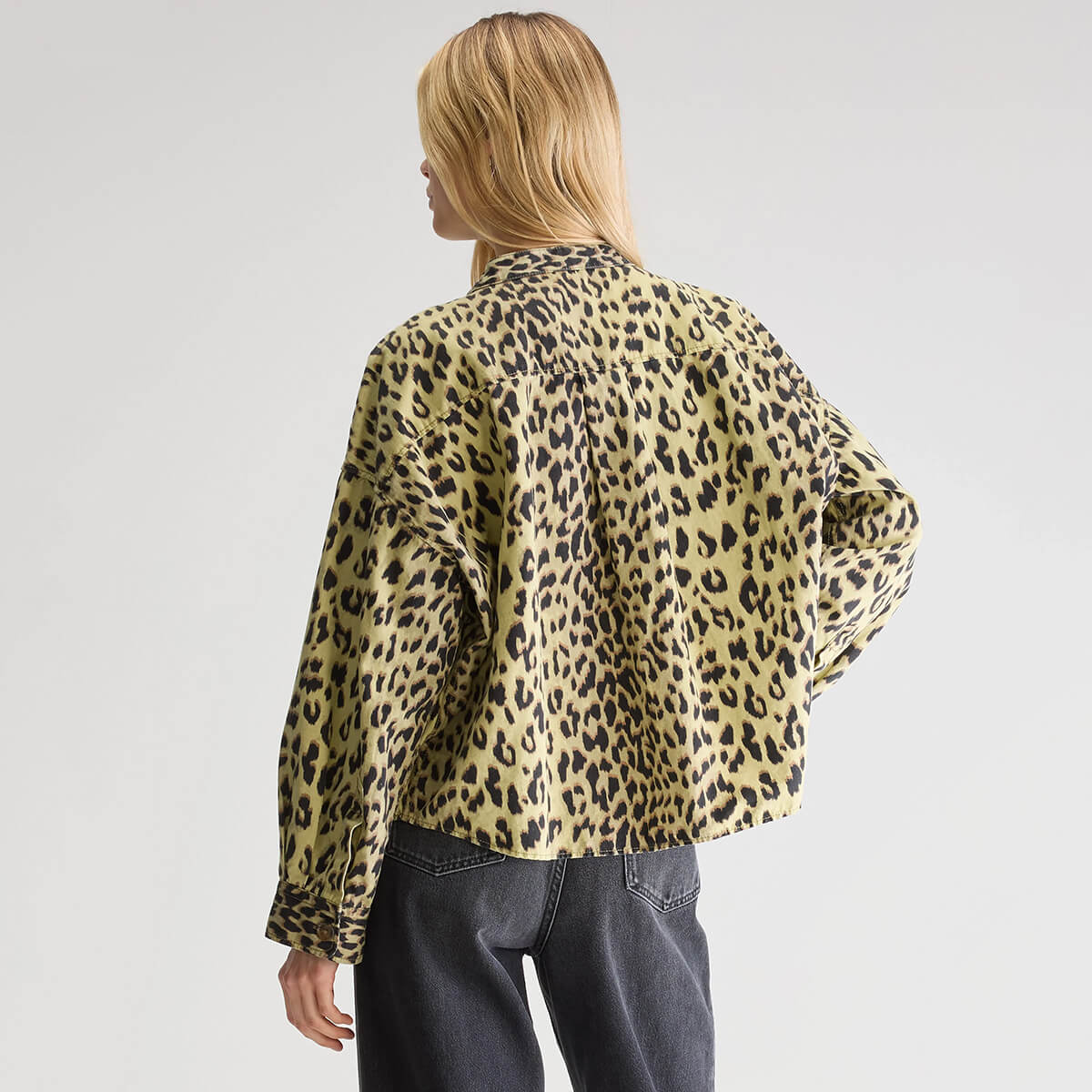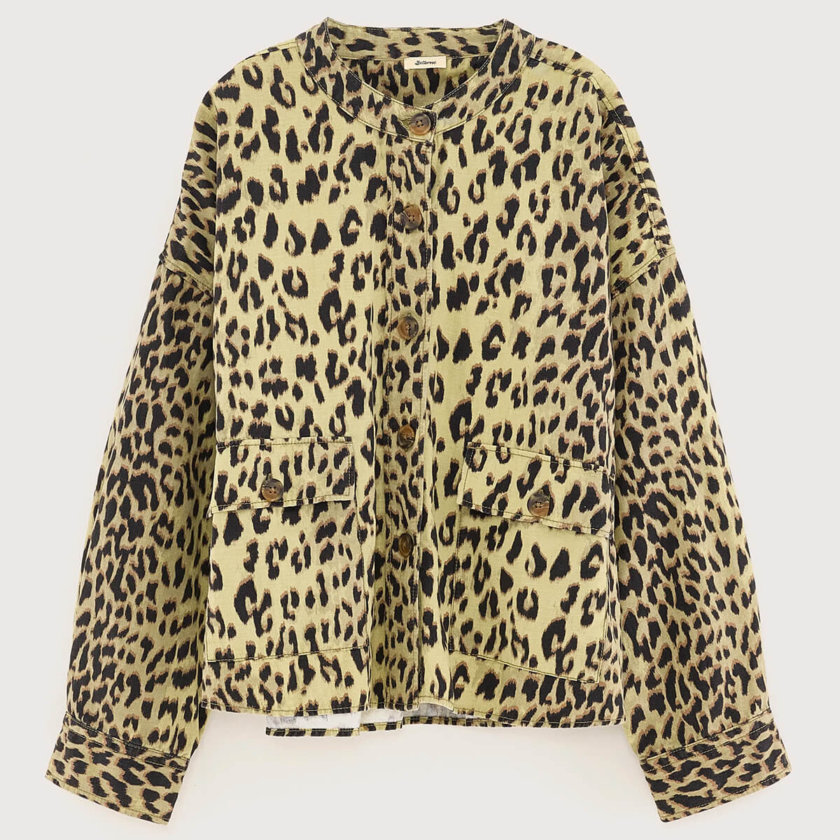 Willie Overshirt by Bellerose. Oversized leopard print overshirt with a button-down front and utility-style pockets.