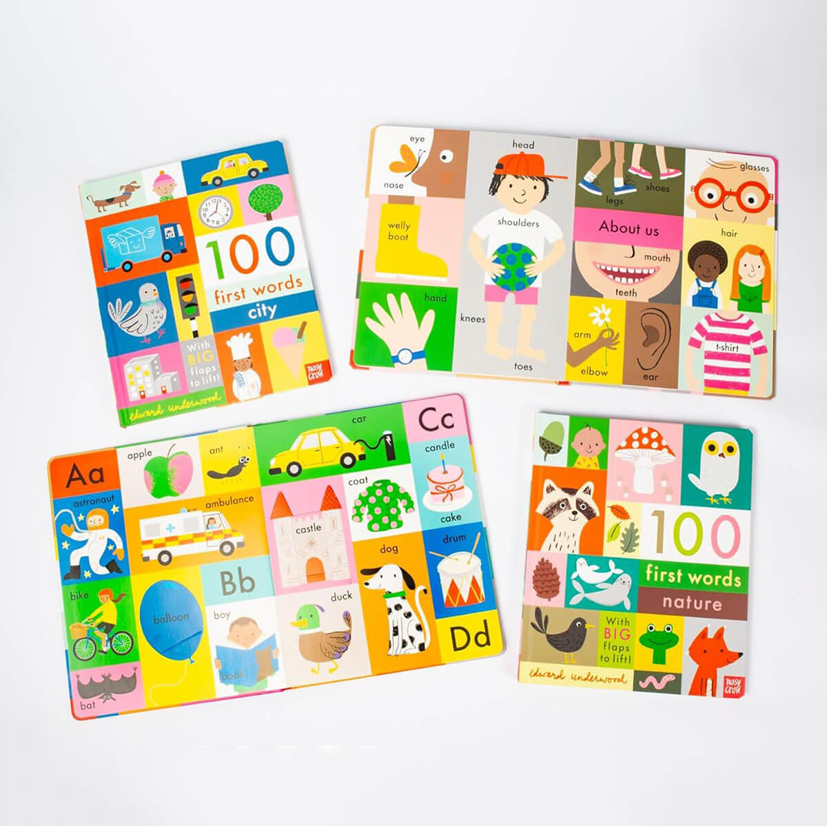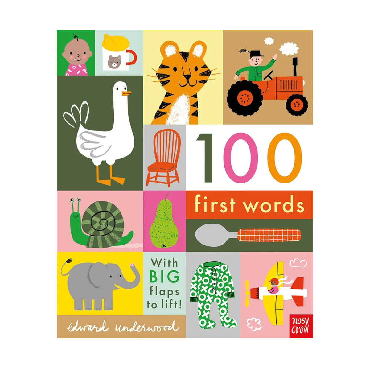 100 First Words by Edward Underwood. This vibrant, large-format board book is both informative AND super-stylish, with flaps to lift on every page! Featuring gorgeous artwork by homeware designer Edward Underwood, which is sure to appeal to parents and toddlers alike, little ones will love discovering what's under the bold, easy-to-lift card flaps as they identify their first 100 words. A sturdy, lift the flap book of simple words set around the farm, the home, outdoors, animals, vehicles and us. Clear text and simple illustrations with flaps that won't fall off as soon as they are used to make this a good buy for the young toddler in your life. Chunky pages mean young fingers should find pages easy to turn.