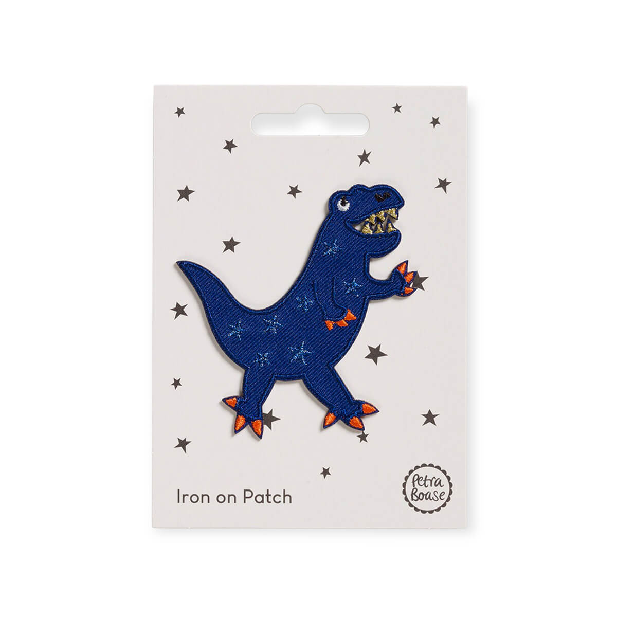Blue dinosaur iron on patch by Petra Boase. Richly embroidered colourful patch, with an iron-on backing so can be removed from the card and ironed on to a favourite t-shirt, rucksack or whatever you like! The patch is a bold blue, with multi coloured embroidered detailing.