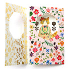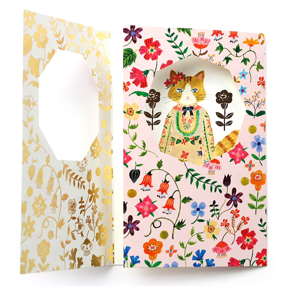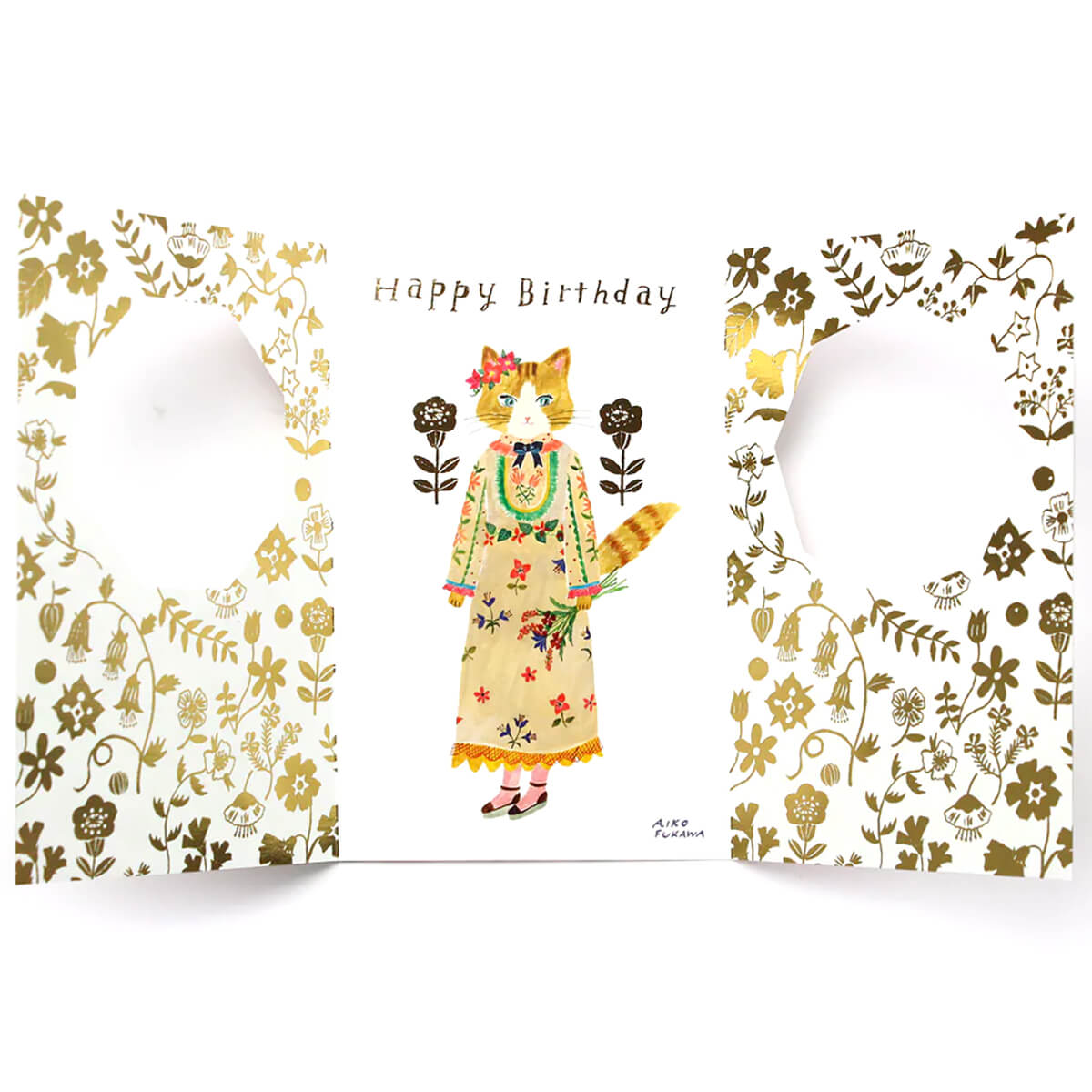 Botanical Garden Aiko Fukawa Birthday Greetings Card by Cozyca. Surprise someone special with this playful birthday card by Japanese designer Aiko Fukawa, which unfold to reveal even more color and pattern on the interior flaps. This botanical garden design folds out to reveal a drawing of a cat.