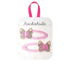 Bright Butterfly hair clips by Rockahula Kids. Flutter like a butterfly with these two sparkling golden butterfly clips, with delicate pink and peach faux-leather details. On pink grosgrain ribbon wrapped snap clips.