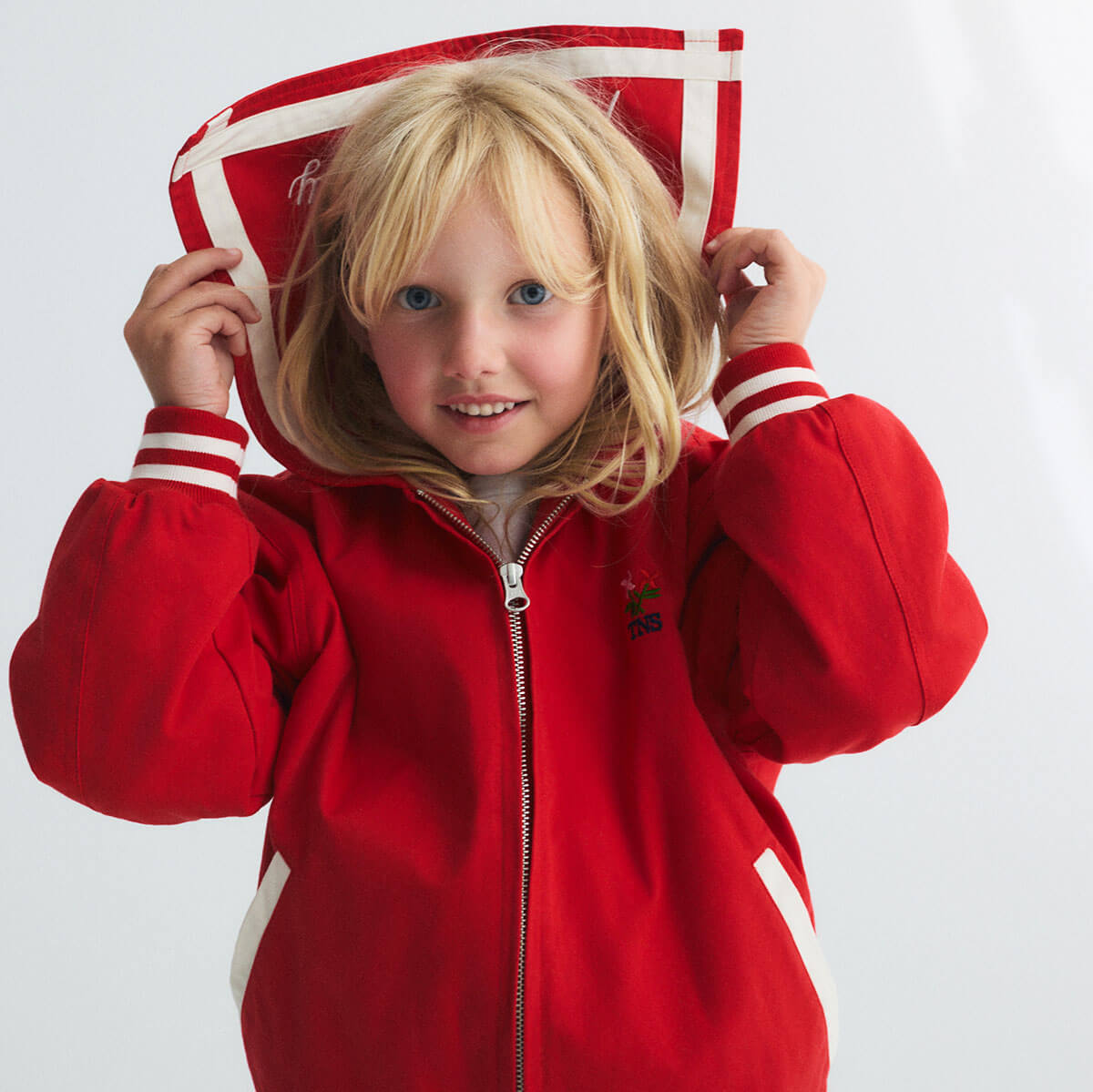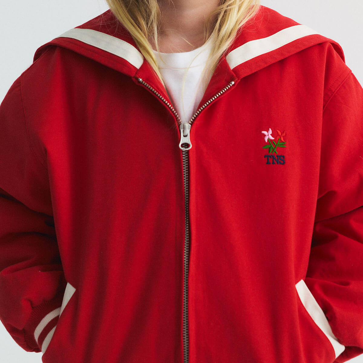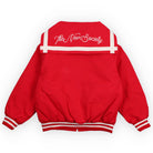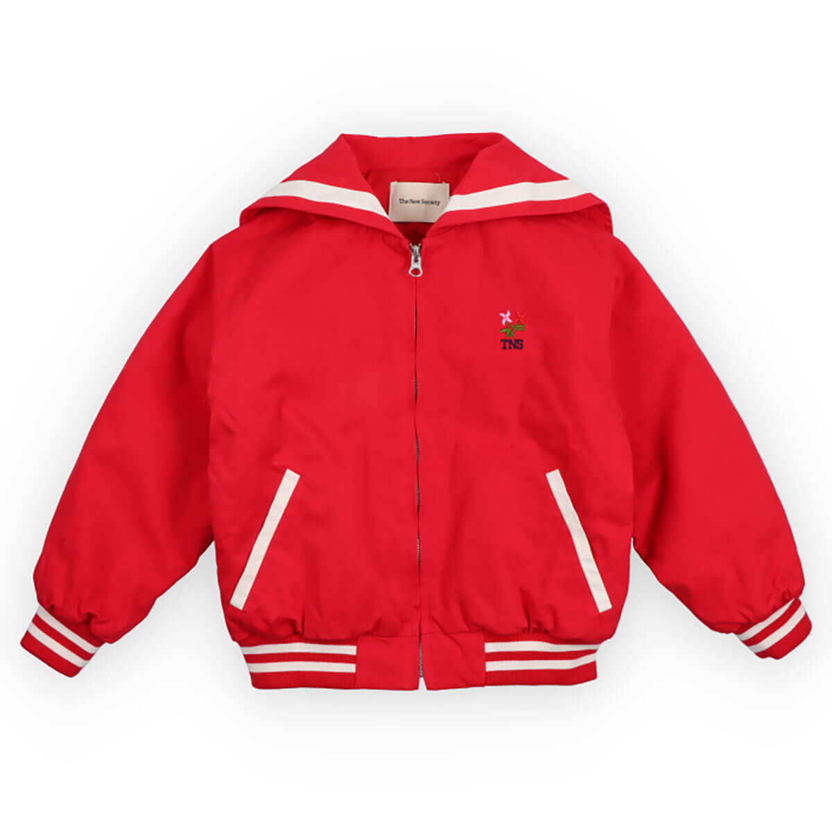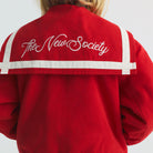 Buttercup Jacket by The New Society. Bomber-style jacket in a fun red tone, featuring a unique sailor collar with an embroidered Society logo on the back and contrasting stripes. Includes front pockets, contrasting snap closure, and a floral branded embroidery on the chest.