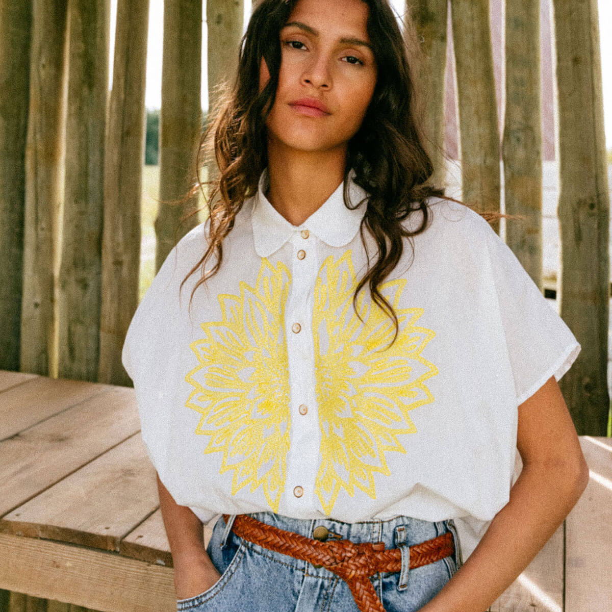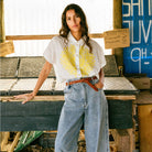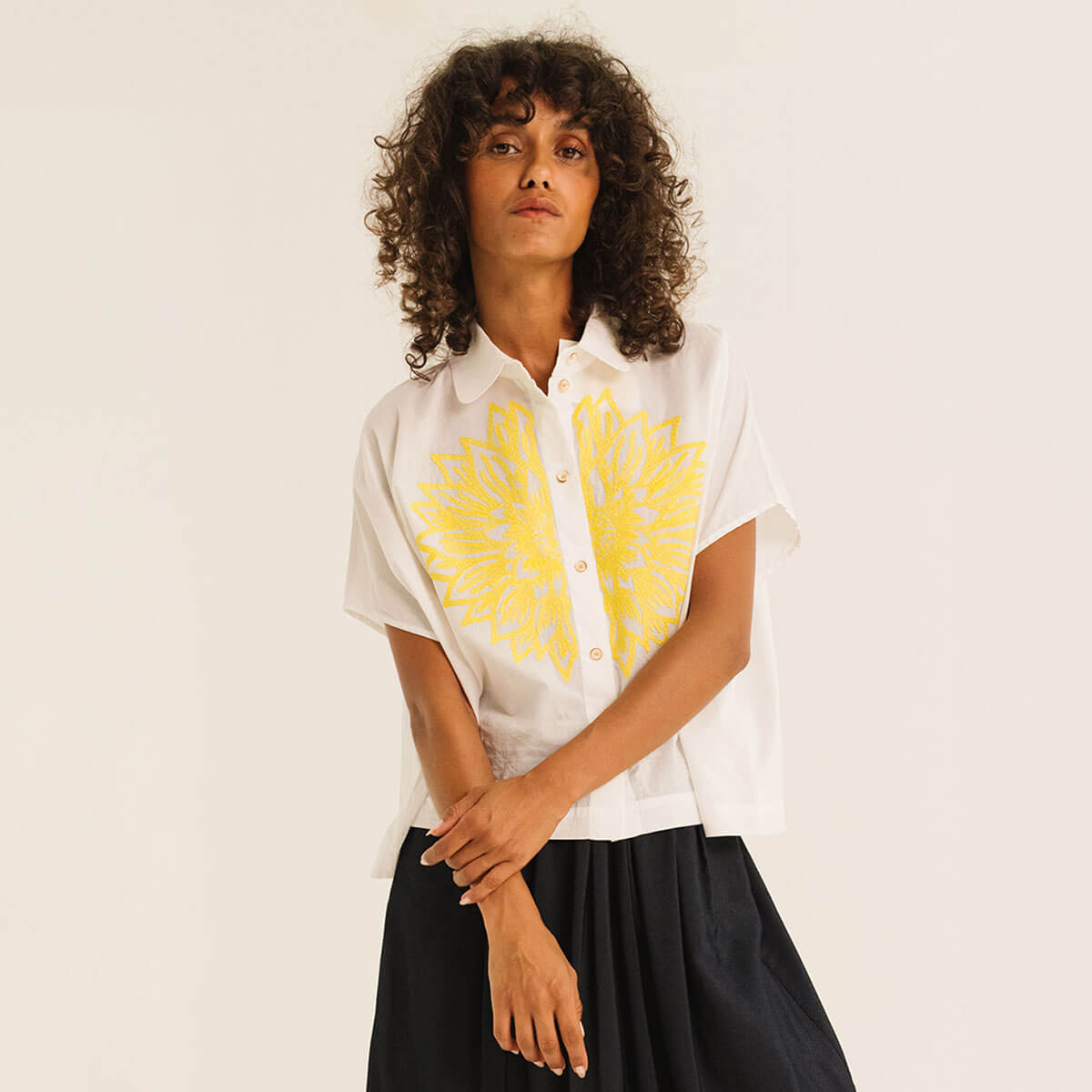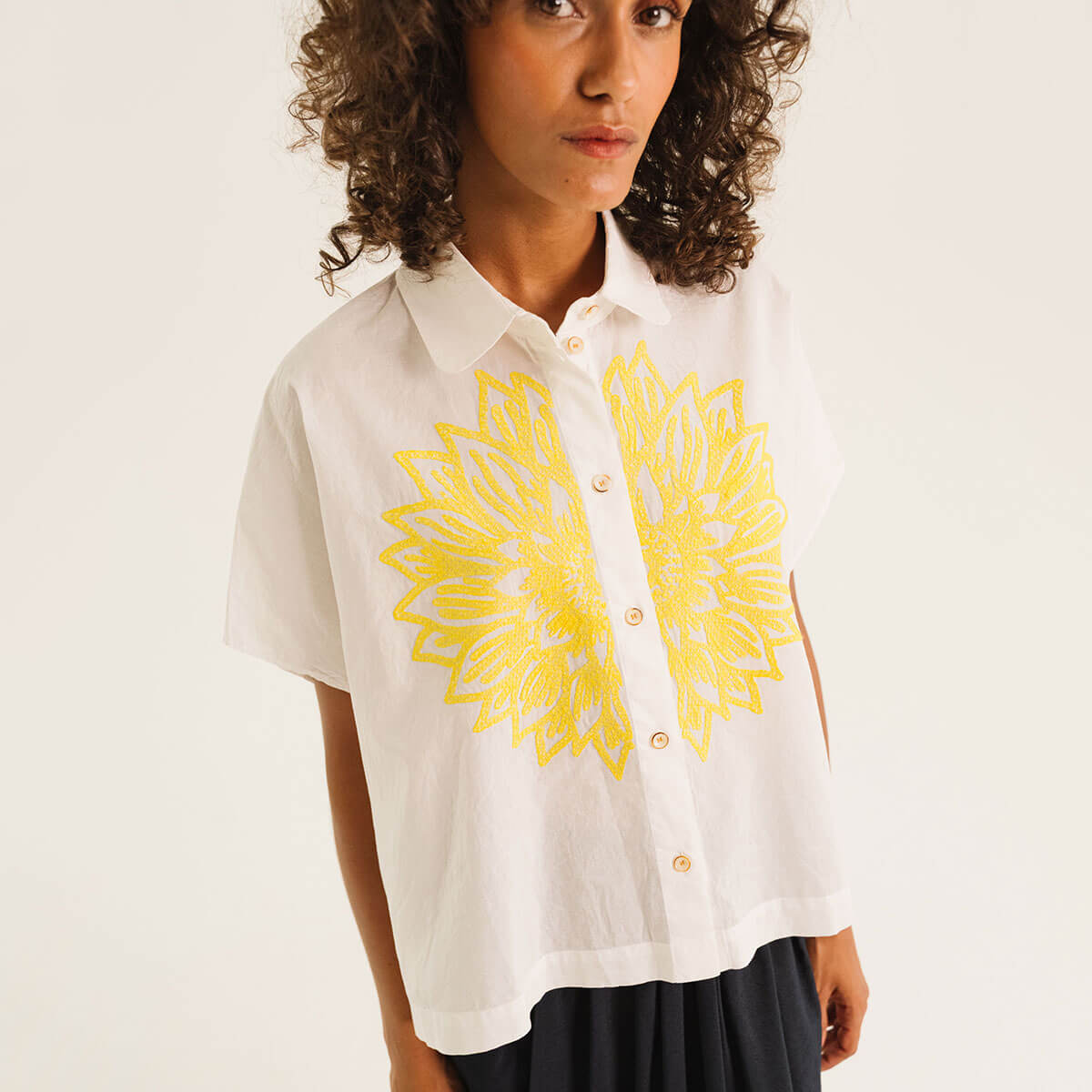 Cinzia Shirt by Tinsels. Cinzia is a short-sleeved, boxy shirt with a rounded collar, cut in an exclusive geometric pattern, cut from a fine poplin embroidered with an exclusive Tinsels design.