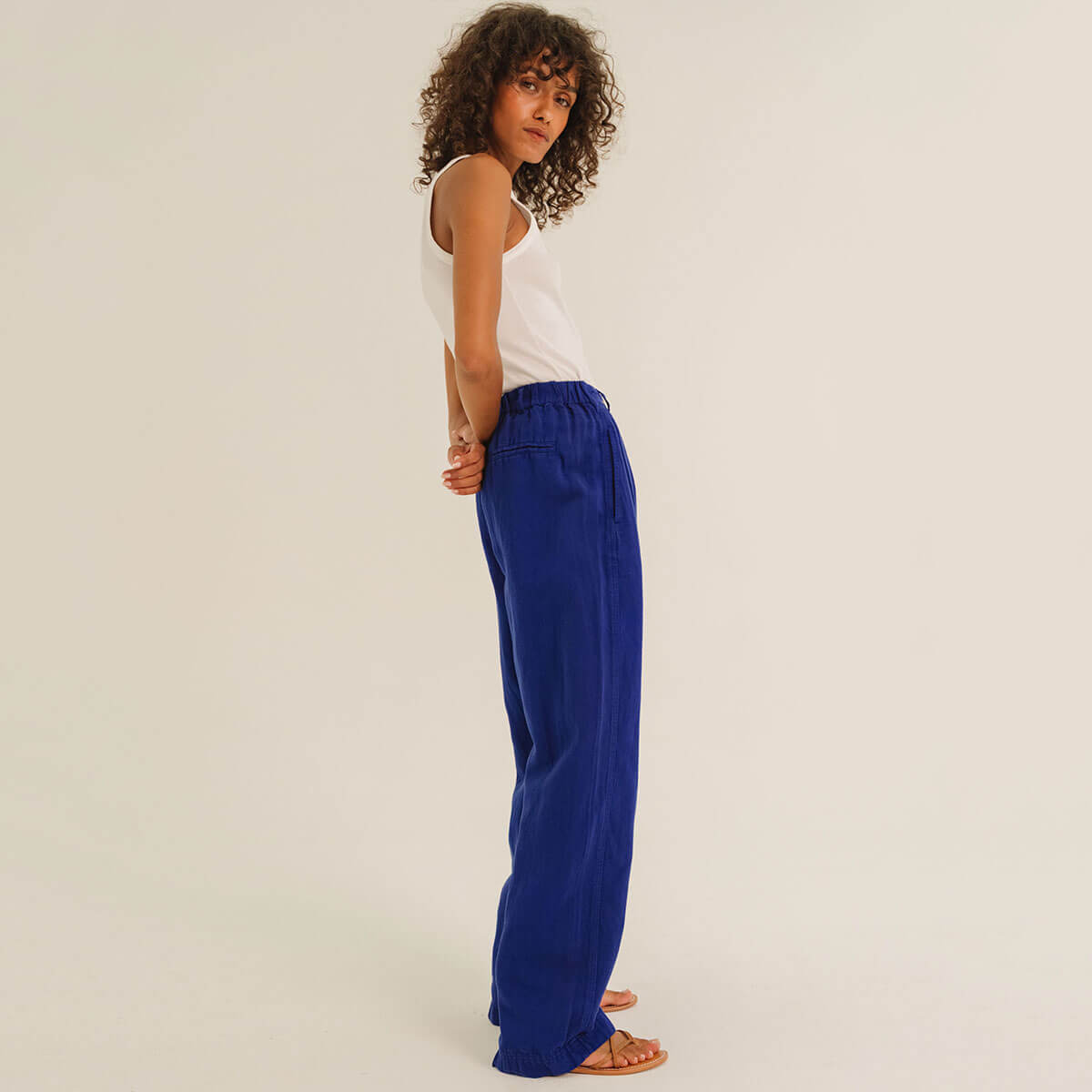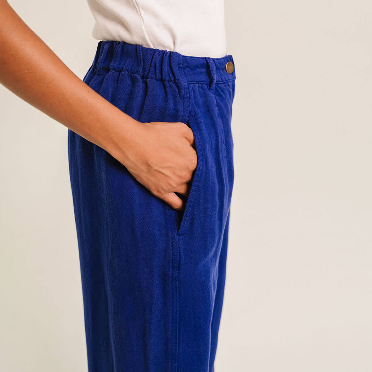 Ettore Trousers by Tinsels. Timeless trousers in a casual fit with slightly tapered legs and an elasticated waistband at the back. Slit pockets at the front and a faux pocket at the back, cut from a linen and cotton blend fabric.