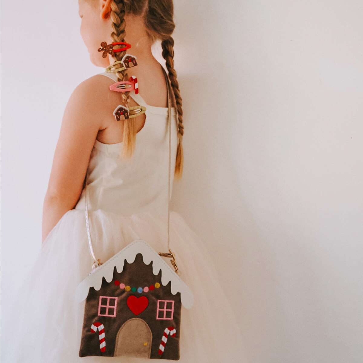 Gingerbread House Hair Clips by Rockahula. Our cosy gingerbread house is the perfect addition to any Christmas outfit! Each little house is detailed with brightly coloured embroidery, features a snow flocked glittery roof, and is secured to a gold ribbon wrapped snap clip.