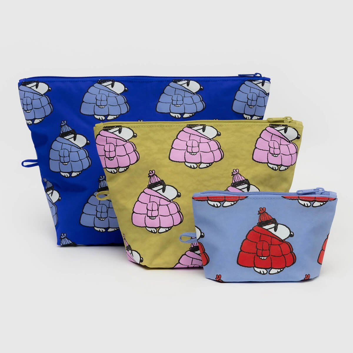 Go pouch set by Baggu. The Go Pouch Set makes it easy to keep your bag neatly packed and organised. Whatever you're carrying — coins, cables, or an extra pair of shoes — this set of three all purpose pouches keeps it together. They expand to hold your essentials and fold flat when not in use.