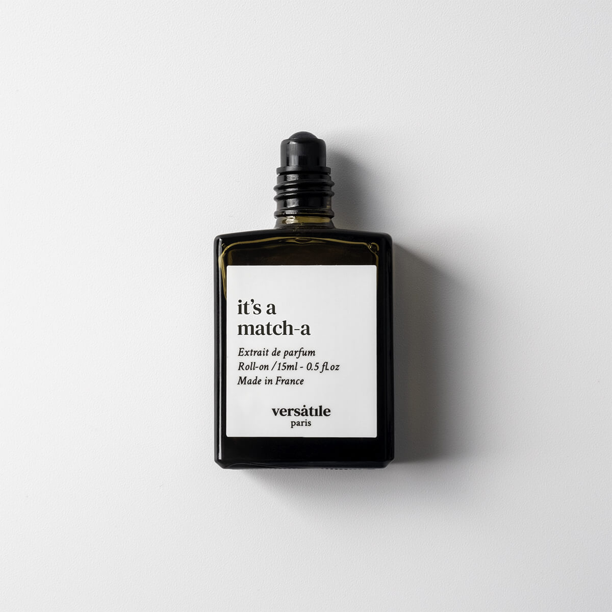 It's A Match-a by Versatile Paris. A milky, green accord, surprising and ultra-gourmand. A meeting between frothy green tea and a generously filled brunch table. This 30% extrait de parfum delivers twice the intensity of an eau de parfum, in a travel-ready, alcohol-free roll-on format. A soft, sweet opening of warm pancake and juicy blueberry melts into the roundness of vanilla and crunchy pistachio. A fragrance of contrasts, where the vegetal freshness of matcha tea meets the creamy smoothness of warm milk. A suave veil, more softness than strictness: sweet, tender, comforting.