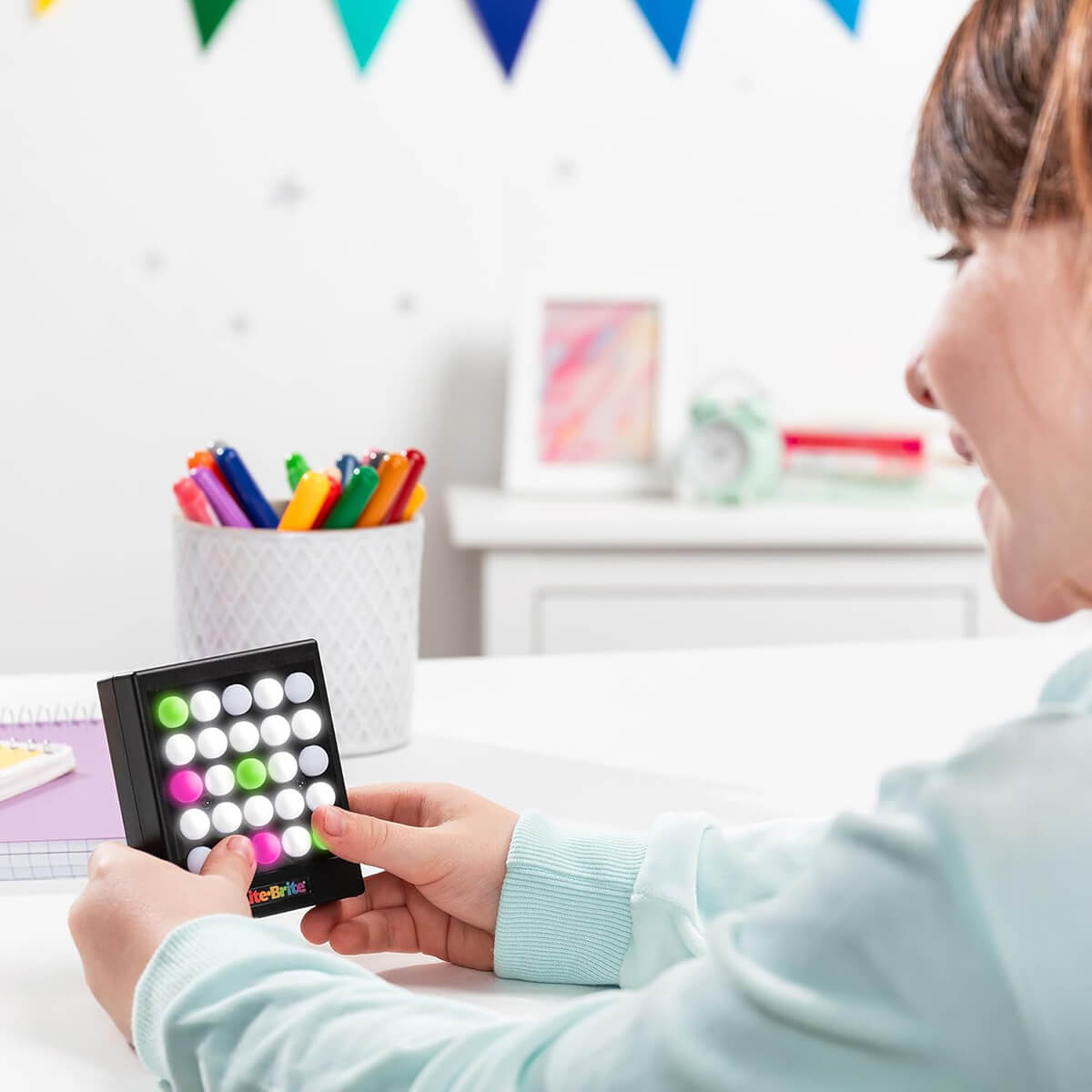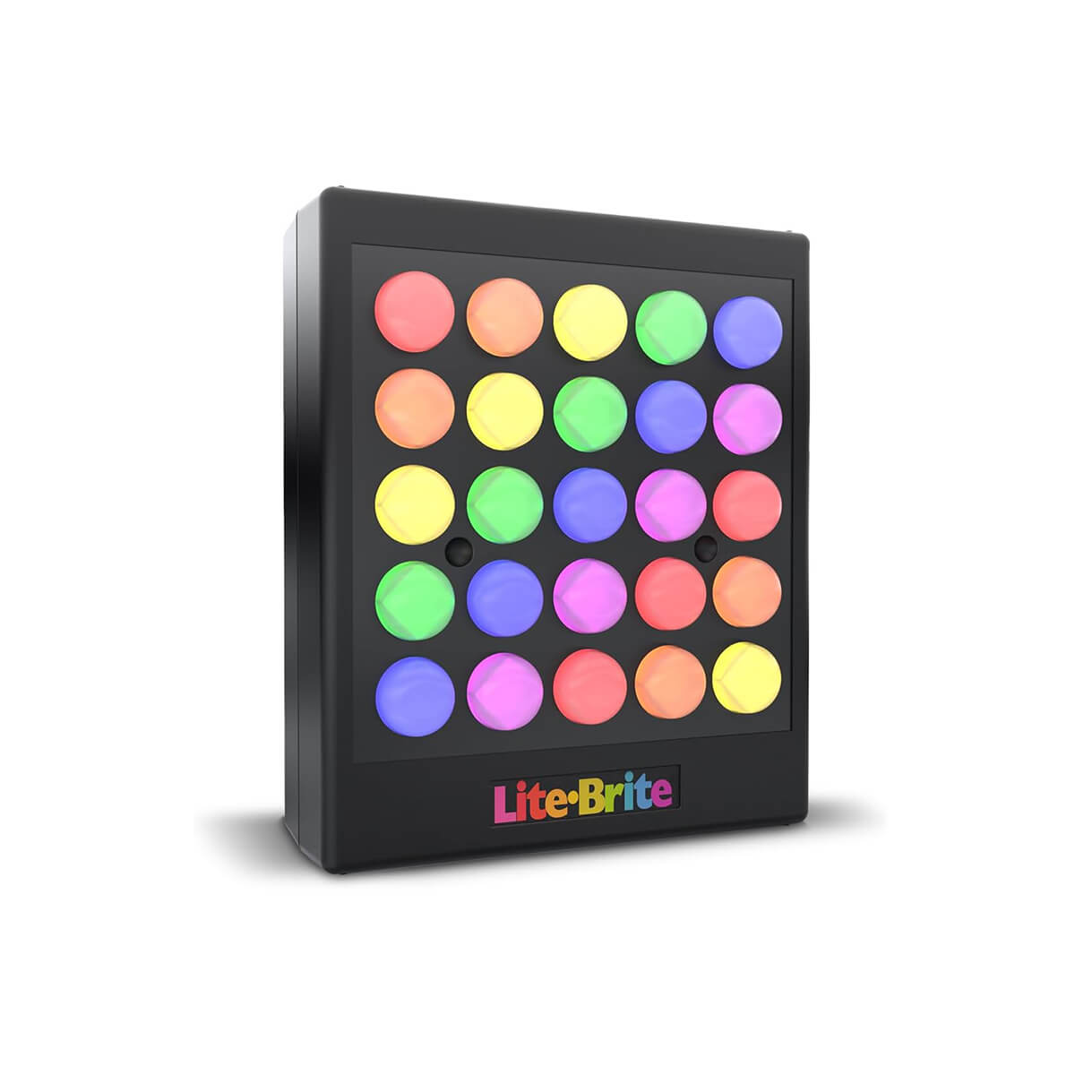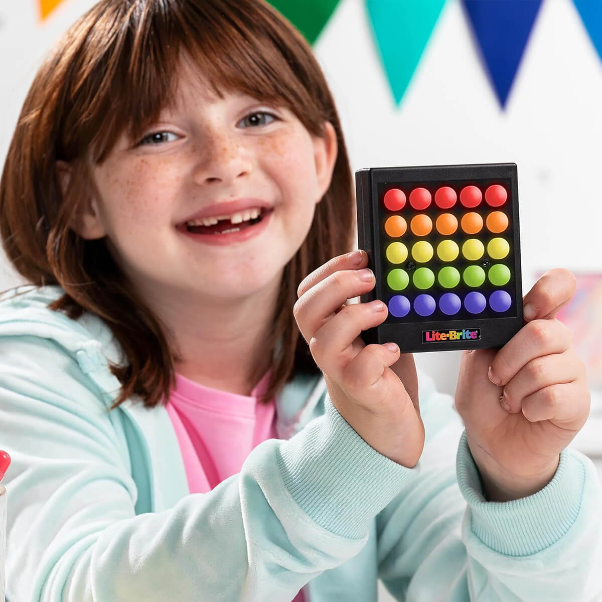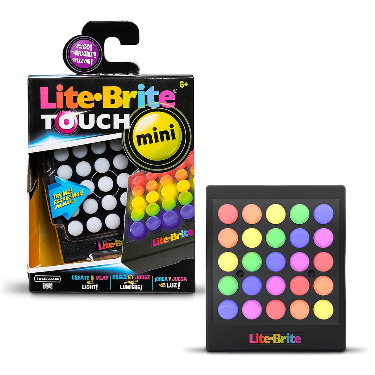 Lite-Brite Touch Mini by Basic Fun. Create with light anywhere! The Lite-Brite Touch Mini lets kids design glowing pictures on a compact, tap-to-light board. Choose a pattern from the included design templates or free-style your own masterpiece, then touch the colour dots to make them shine. Perfect for car rides, cafés, and creative downtime—nostalgic Lite-Brite magic in a grab-and-go size.