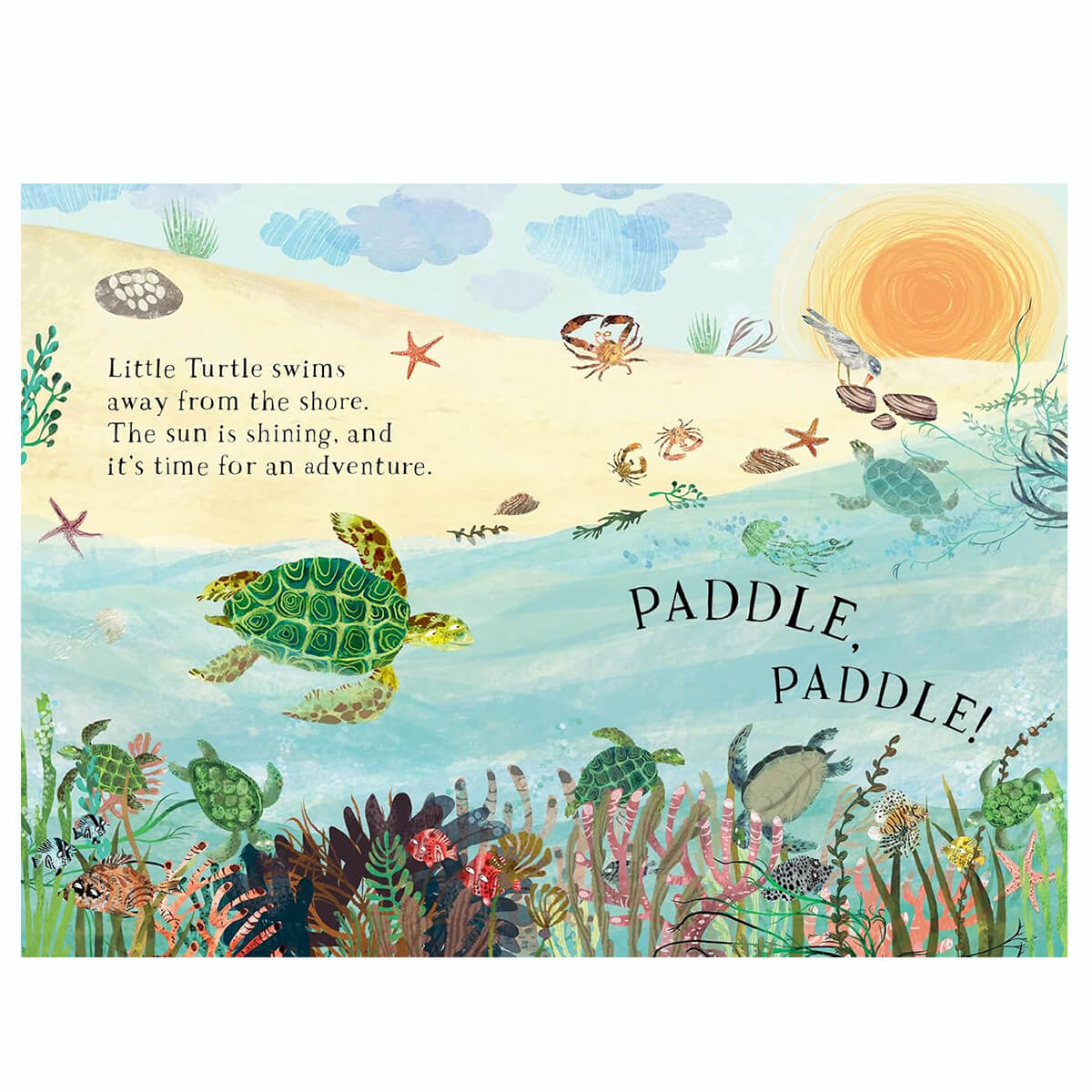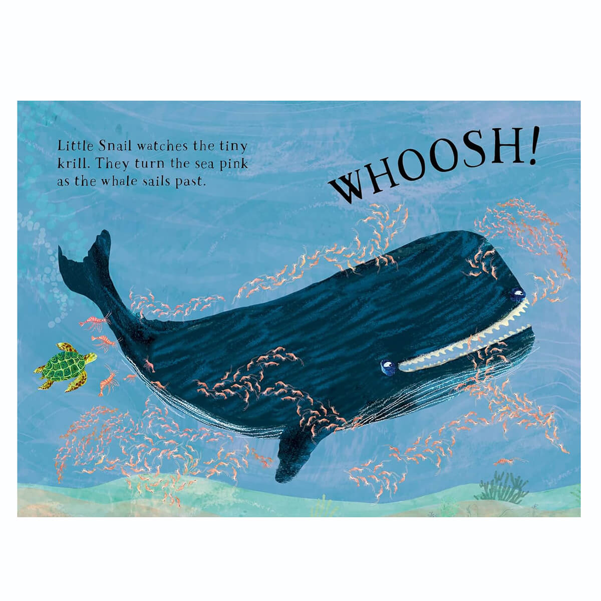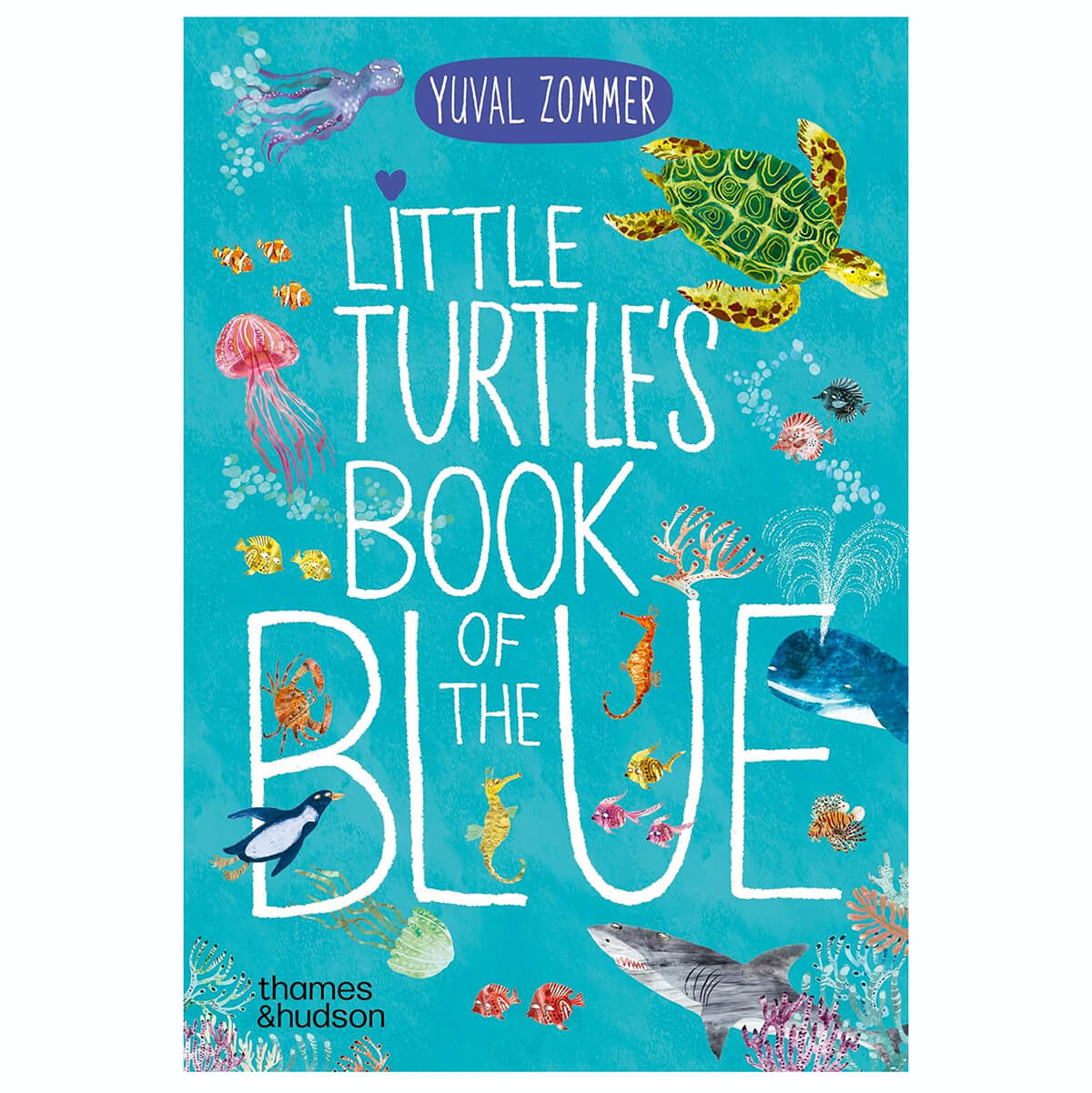 Little Turtle's Book of The Blue by Yuval Zommer. Dive and drift with Little Turtle as he embarks on an undersea adventure and discovers all sorts of marine life. Packed with Yuval Zommer's gorgeous illustrations, tons of creatures to spot and fun onomatopoeia words to read out loud, this chunky board book is perfect for any child who loves the sea. Join Turtle for a swim around the ocean, and meet ten species of sea life, from flying fish to an enormous whale. The book finishes with a peaceful scene, perfect for bedtime reading. This reimagining of the bestselling The Big Book of the Blue highlights endangered species and is designed to instil an early love for the natural world and the varied and vulnerable creatures that live in it.