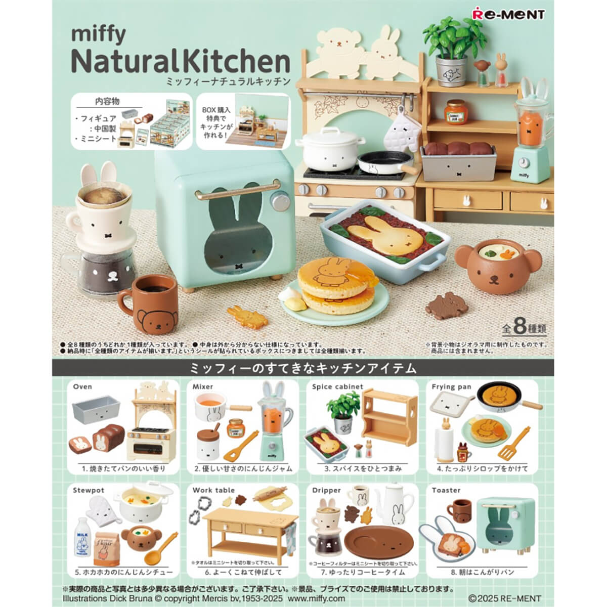 Miffy Natural Kitchen Blind box by Re-Ment Japan. The Miffy Natural Kitchen series from Rement features a charming miniature set of Miffy kitchen decor and dishes. Collect all eight for the complete kitchen scene, with a work table, oven, mixer, spice cabinet, frying pan, stewpot, dripper and toaster.