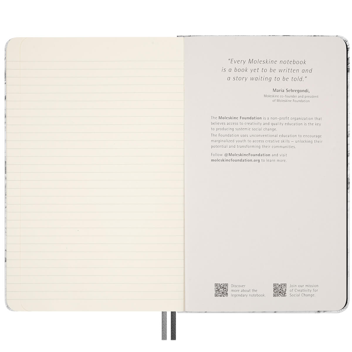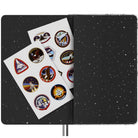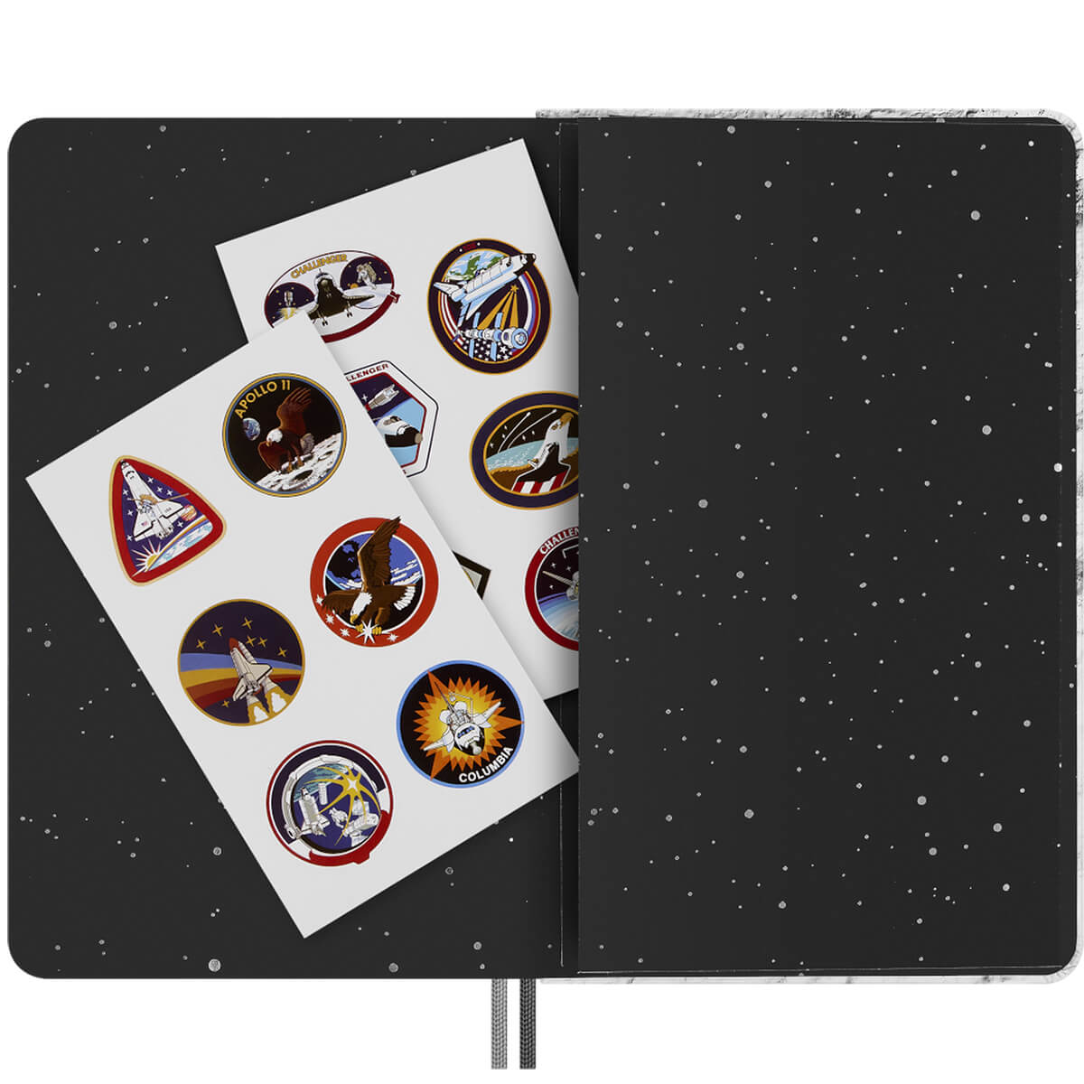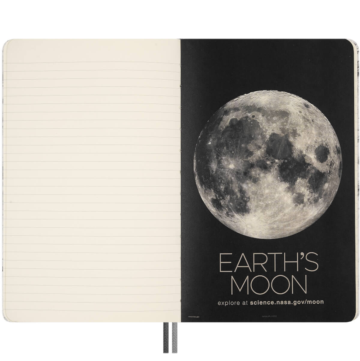 NASA Limited Edition Moon Notebook by Moleskine. Large ruled Moleskine notebook with a large, soft-touch cover notebook inspired by the moon's surface. This collection pays tribute to the pioneering spirit that drives every breakthrough — reminding us that even the boldest missions begin with a single idea scribbled down on a page. Because putting pen to paper is the best way to explore the boundless potential of human genius. Includes an expandable inner pocket and NASA themed stickers to customise your notes.