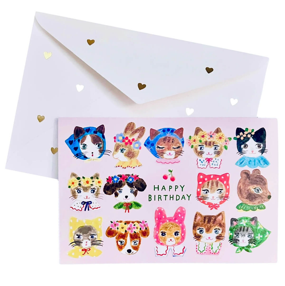 Niko Niko Smile Aiko Fukawa Birthday Greetings Card by Cozyca. Surprise someone special with this playful birthday card by Japanese designer Aiko Fukawa, an essential addition to your stationery collection. The beautiful rendered illustration depicts rows of cute cats, pups, and other animals in festive attire. Complementing this special card is a lovely envelope adorned with a smattering of gold foil hearts.