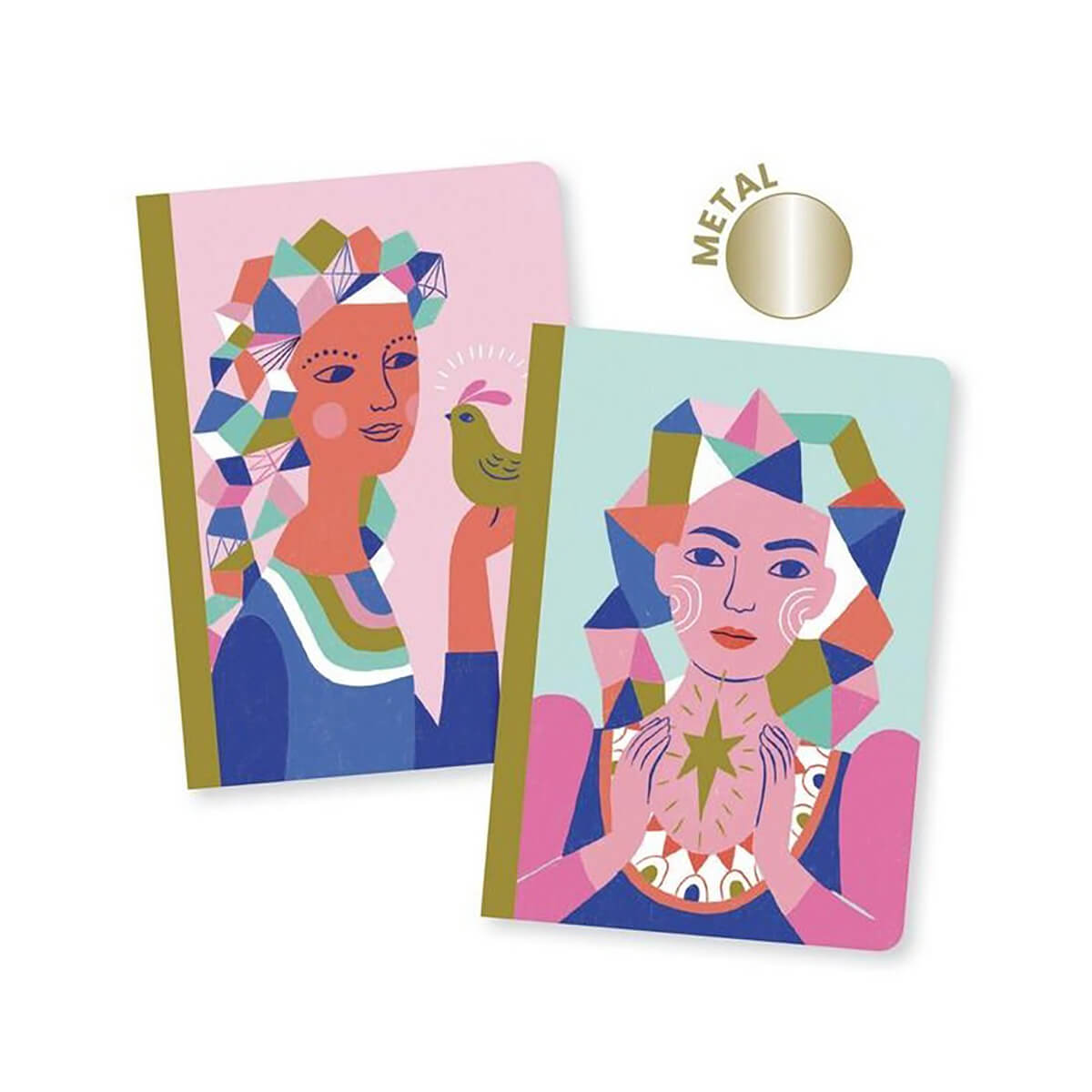 Sarah Little Notebooks by Djeco. Two small notebooks with beautiful, cute and graphic illustrations to take everywhere and write and draw your thoughts. This set consists of a notebook with lines and a notebook with blank pages. Each notebook contains 40 pages, all of which are also illustrated with small drawings.