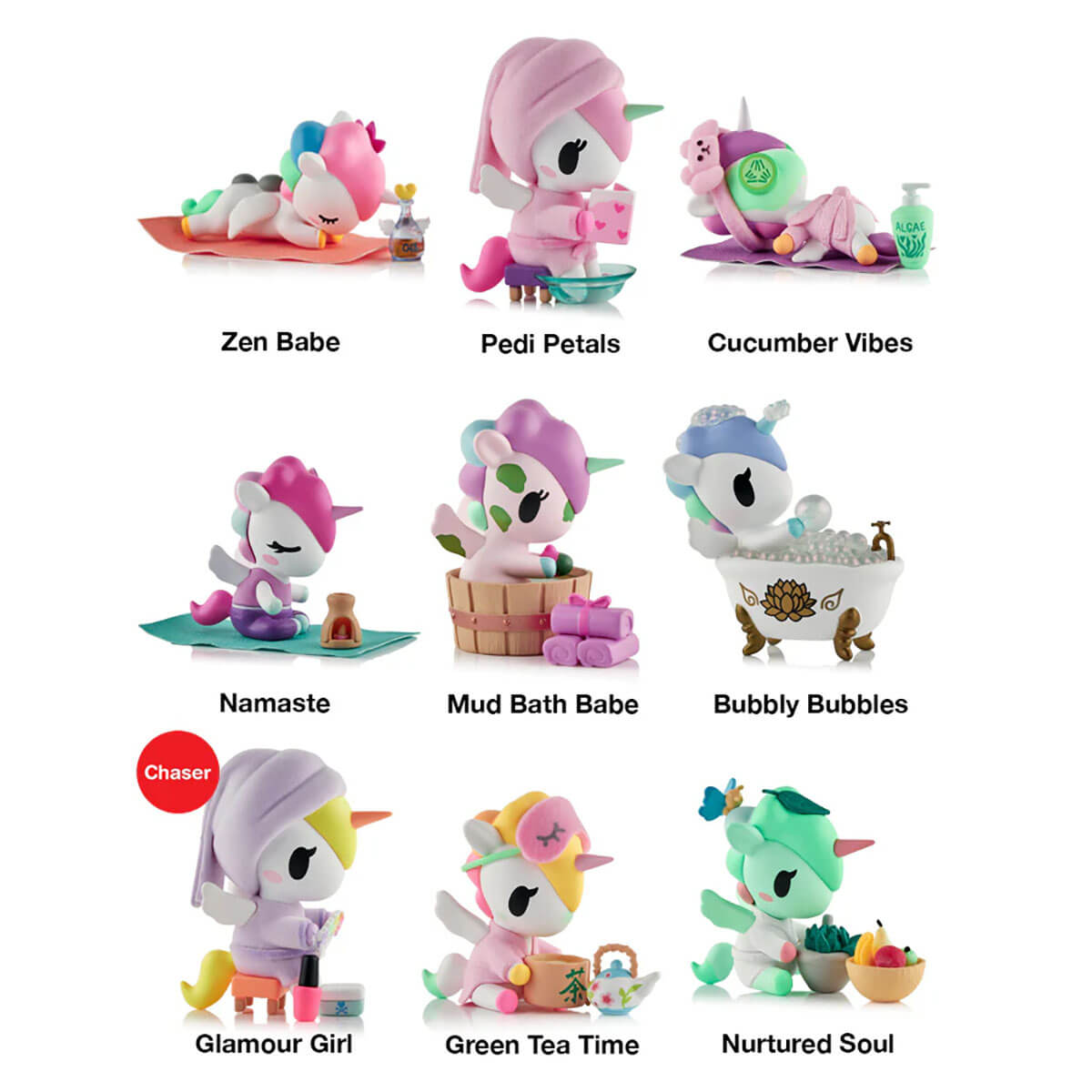 Spa Day Unicorno Blind Box by Tokidoki. Relax, refresh, and reveal a surprise! The Spa Day Unicorno Blind Box series brings pampering vibes and peaceful charm to your Unicorno collection! This relaxing 9-figure series includes characters like Zen Babe, Mud Bath Babe, Bubbly Bubbles, Pedi Petals, and more! Treat yourself to a little kawaii wellness!