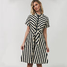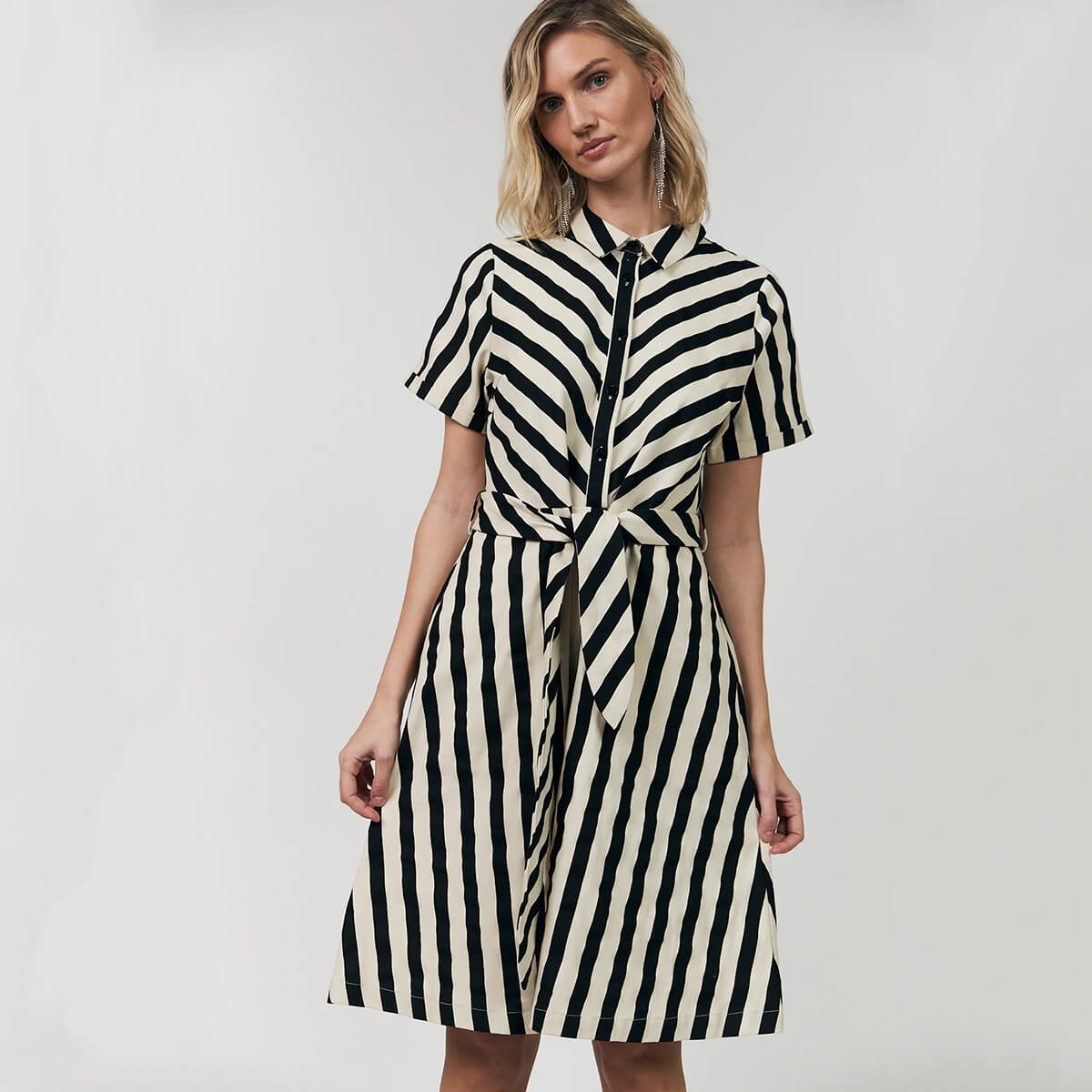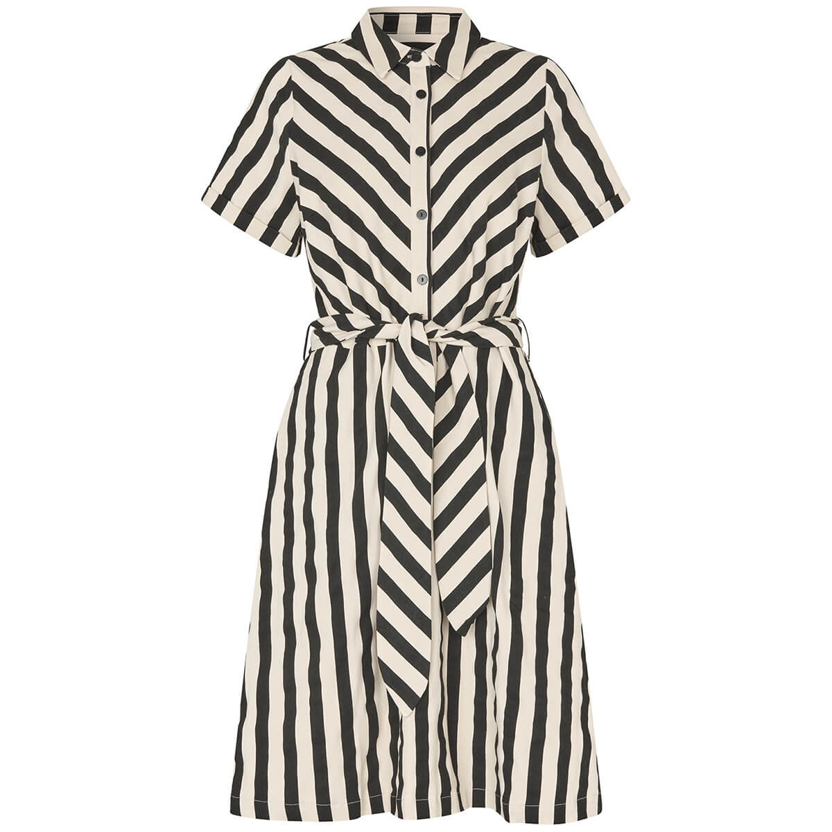 Tulle Midi Dress by Lollys Laundry. A charming and timeless shirt dress with a modern striped design. The Tulle dress is made from a soft and comfortable quality, perfect for both everyday wear and special occasions. The diagonal stripes on the front create a flattering and eye-catching look that gives the dress a unique twist.