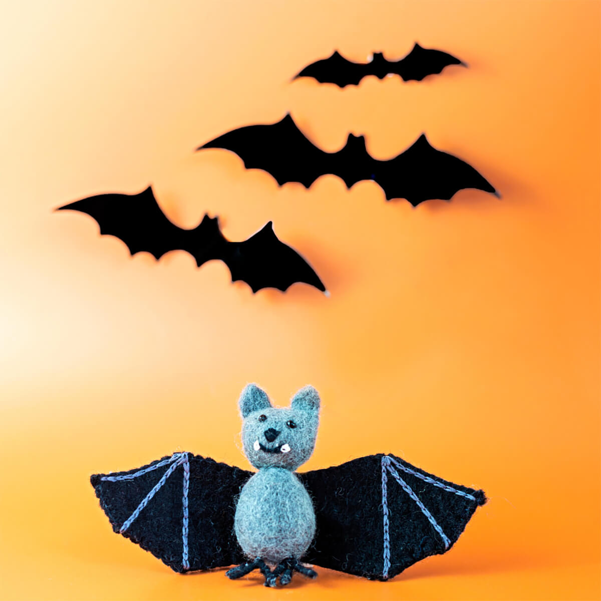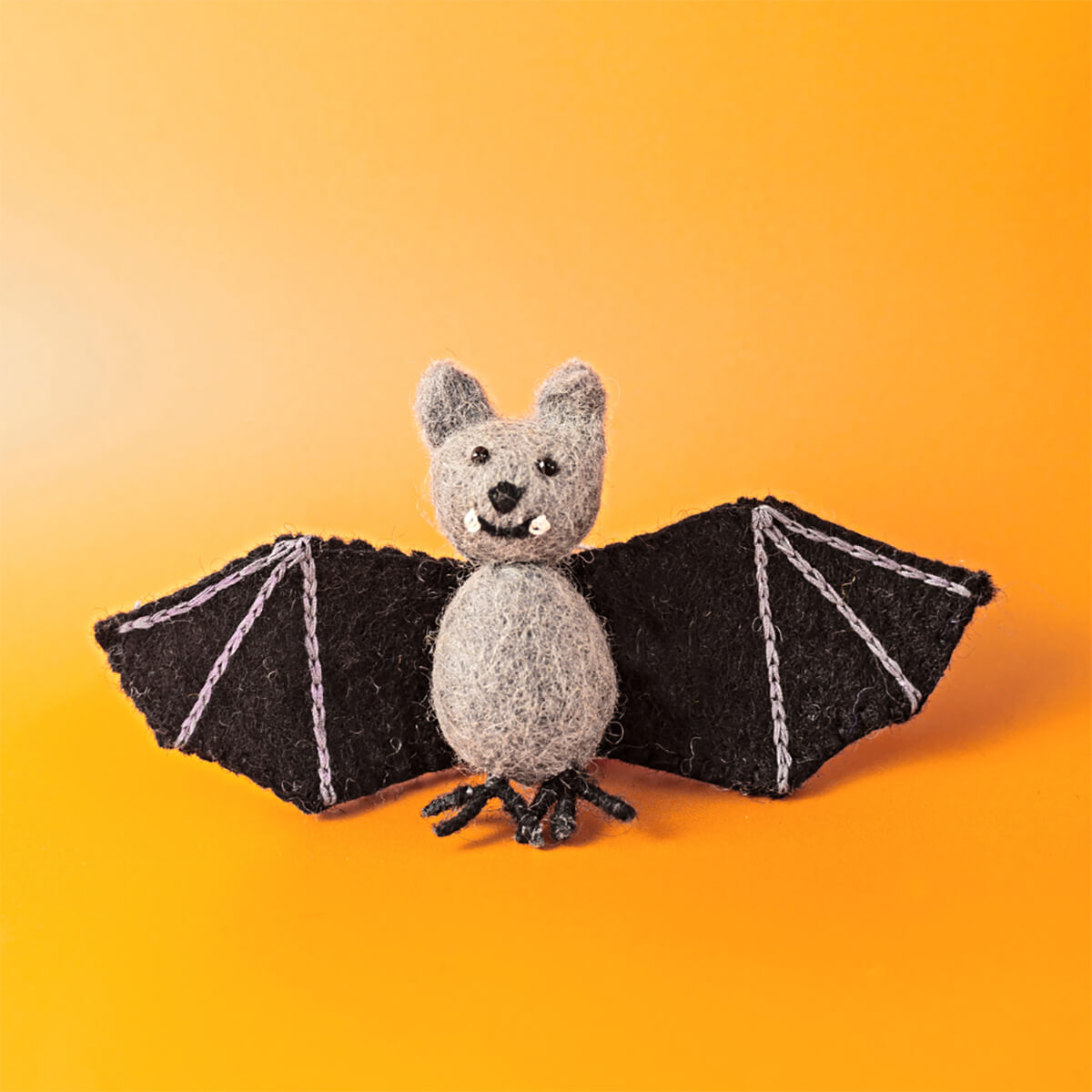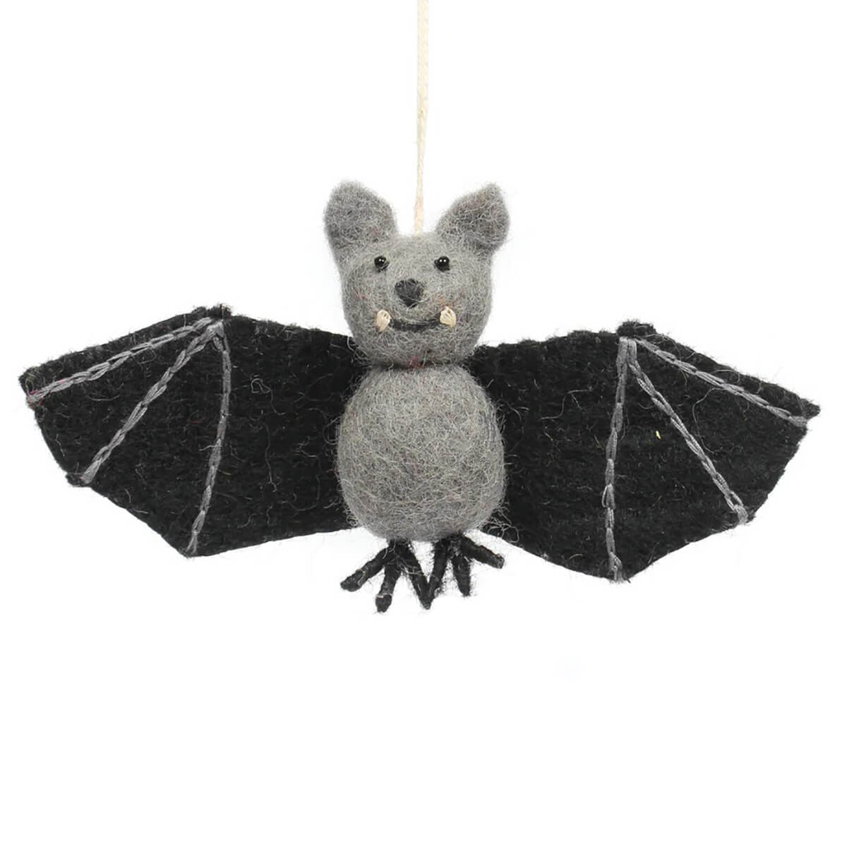 Bat hanging Halloween decoration by Amica. Rest assured this bat won't get caught in your hair - he is just way too cute. Comes with a hanging loop to hang anywhere you need a little extra spookiness this Halloween. A beautiful, handmade and fair trade felt decoration.