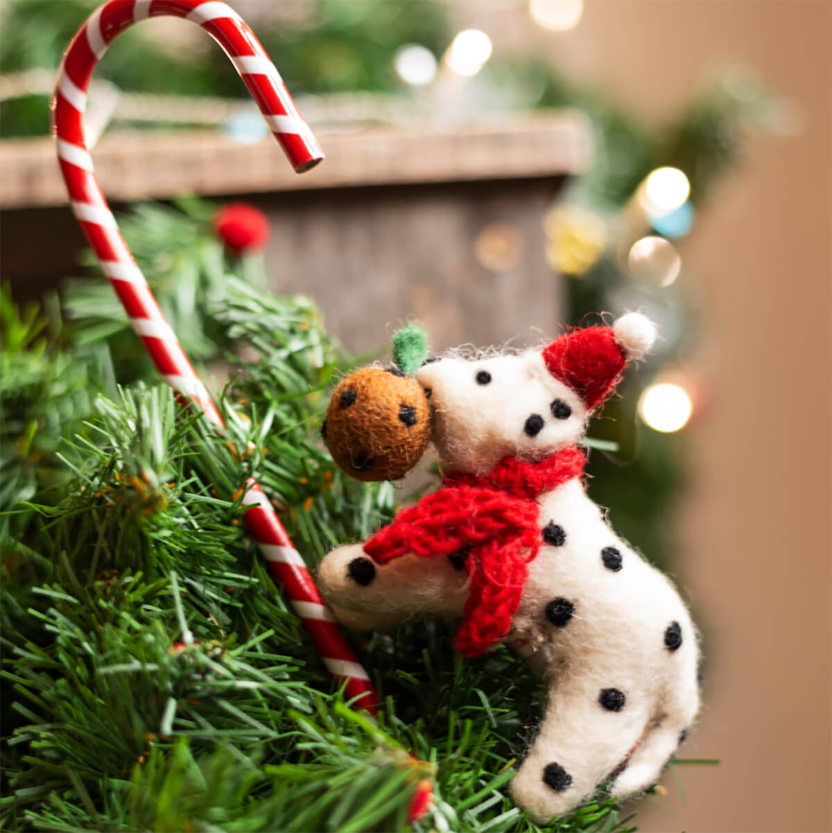 Dalmatian with Christmas pudding hanging decoration by Amica. A beautiful, handmade and fair trade felt decoration.