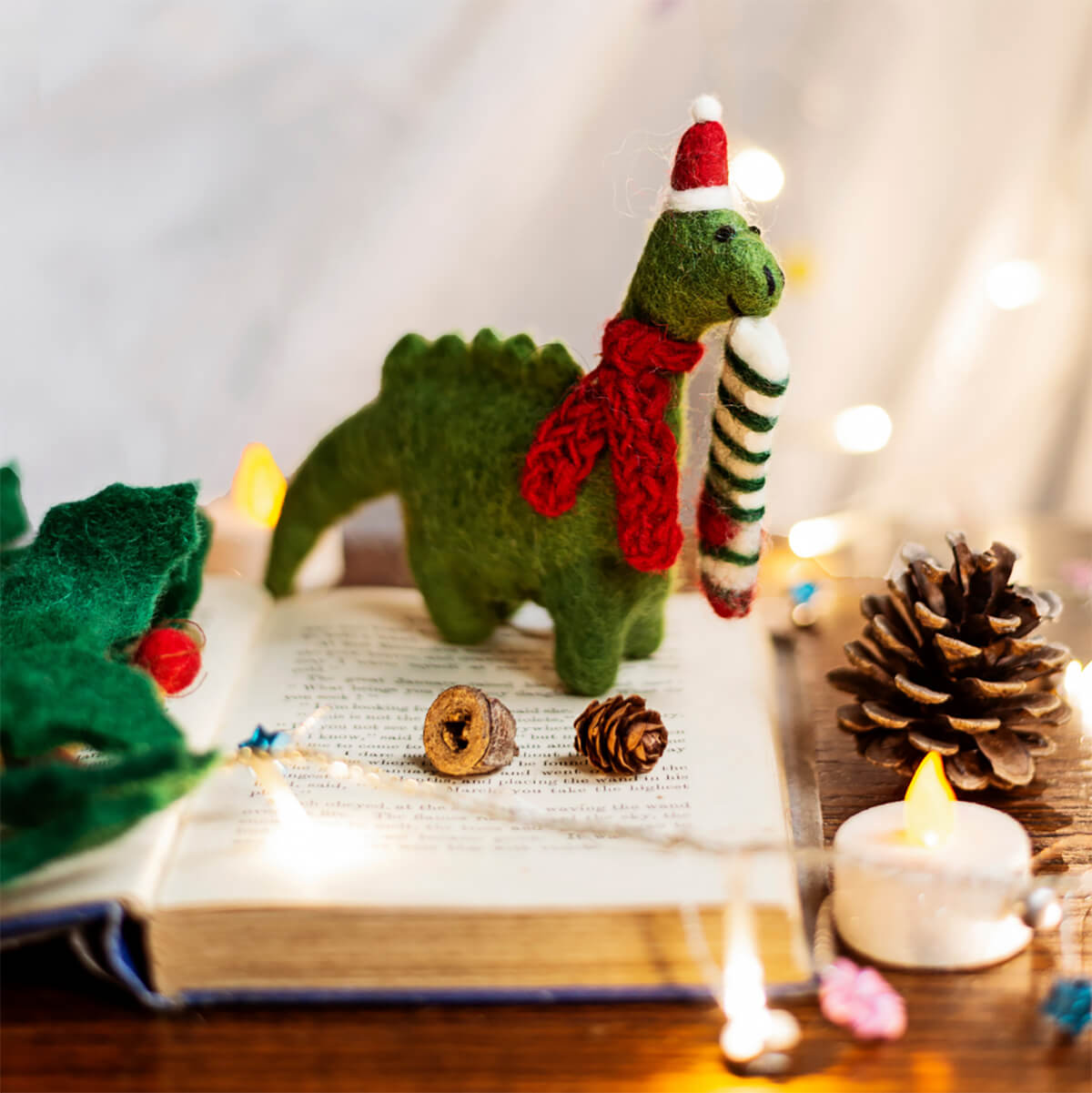 Diplodocus with stocking hanging Christmas decoration by Amica.A beautiful, handmade and fair trade felt decoration showing that even in the Jurassic Period Christmas was worth celebrating! A beautiful, handmade and fair trade felt decoration.