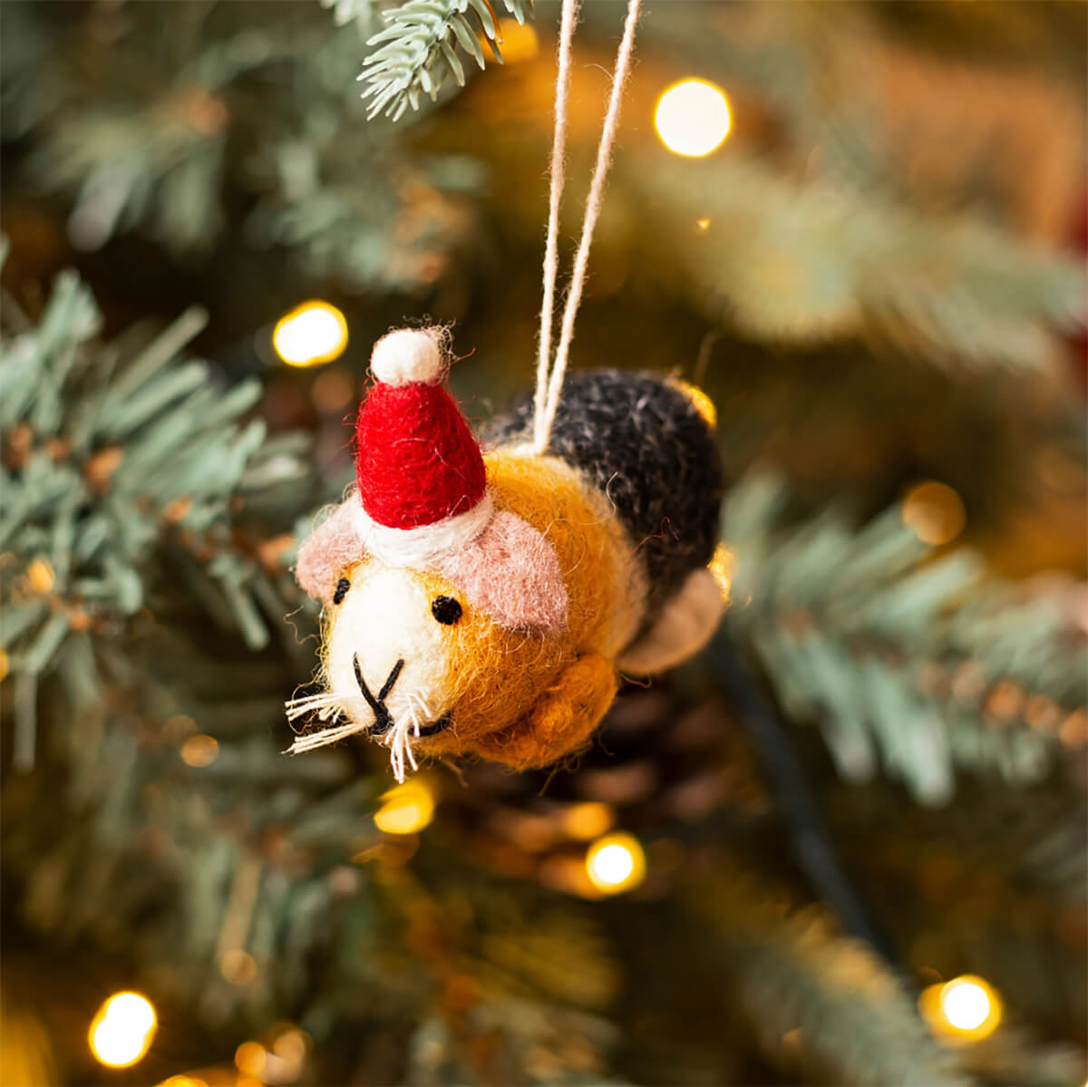 Guinea pig in Santa hat felt hanging tree decoration by Amica. A beautiful, handmade and fair trade felt decoration.