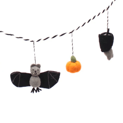 Pumpkin & Bat Garland Halloween decoration by Amica. A lovely Halloween Garland made up of Pumpkins and Bats. Comes with a hanging loop to hang anywhere you need a little extra spookiness this Halloween. A beautiful, handmade and fair trade felt decoration.
