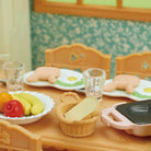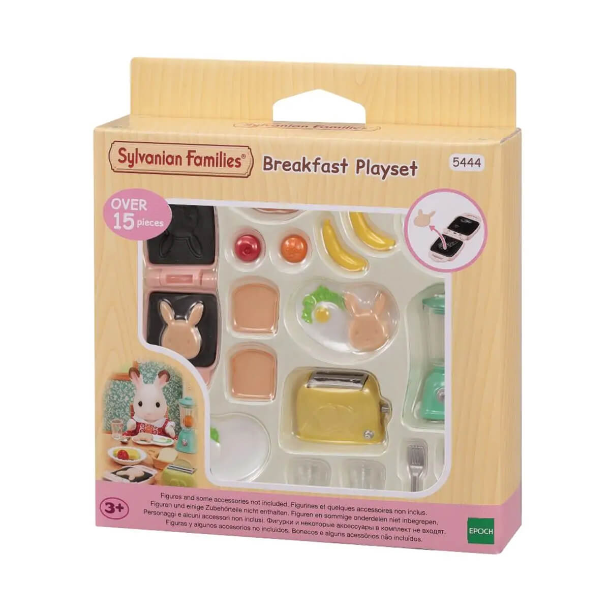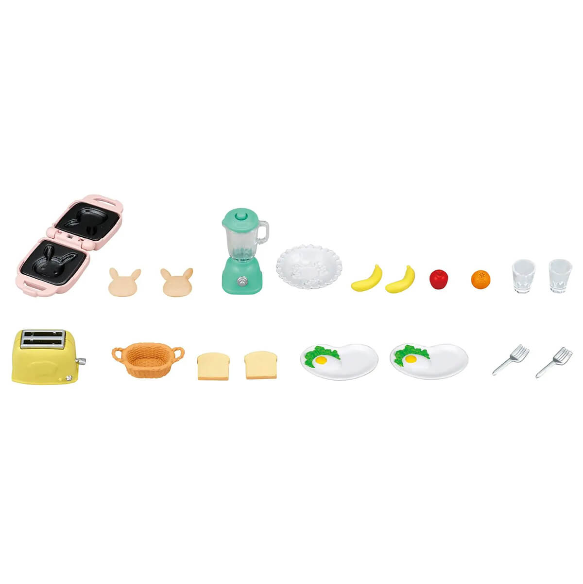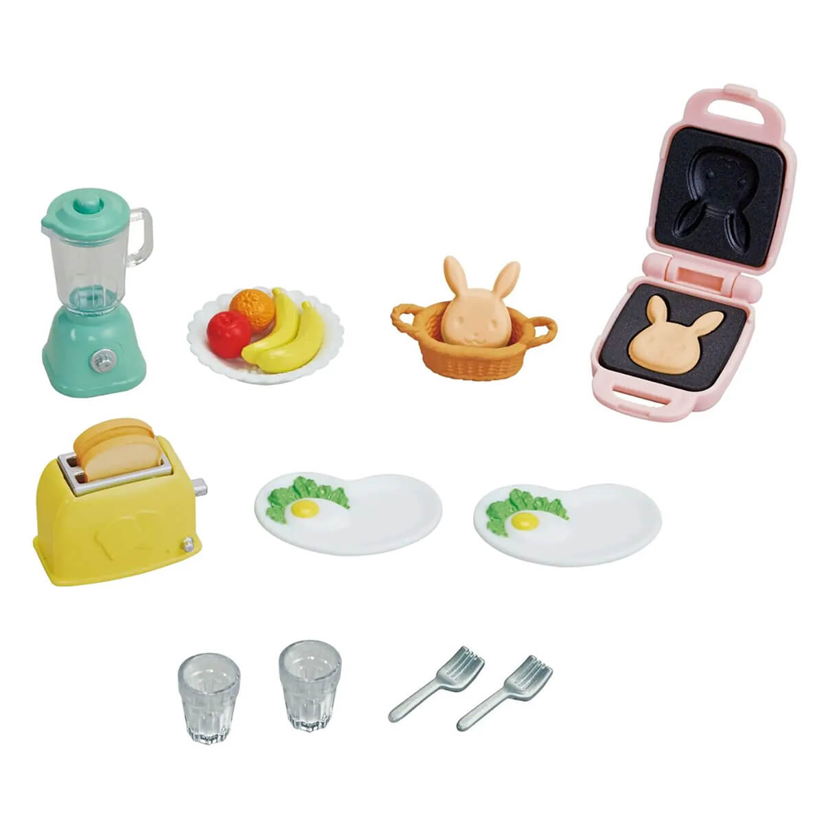 Breakfast Playset by Sylvanian Families. Create an even more livelier Kitchen with this Breakfast Playset, ranging over 15 pieces of breakfast and cooking utensils. Bread can be placed in the pop-up toaster. By pressing the toaster lever, toast will pop up. The hot sandwich maker can be opened ad closed.