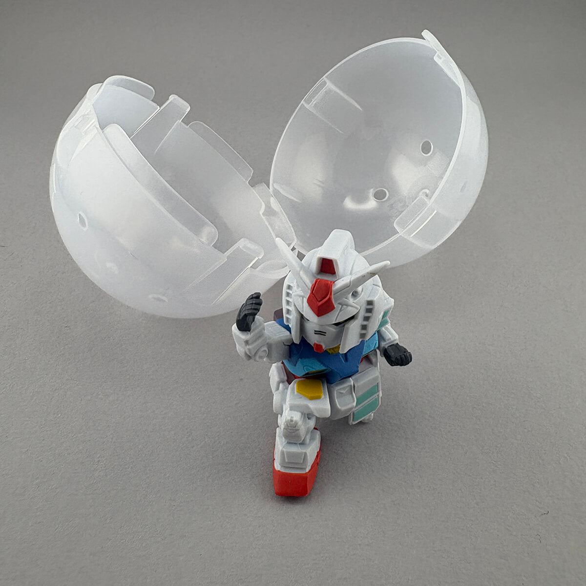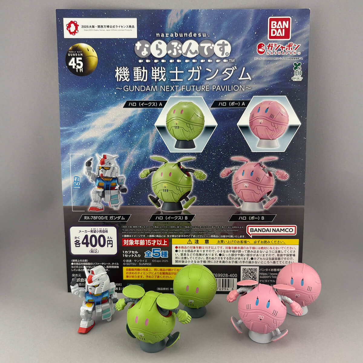 Mobile Suit Gundam Next Future Pavilion Narabundesu Gachapon Capsule Collectible by Bandai. To coincide with the exhibit at EXPO 2025 Osaka-Kansai Expo Gundam Next Future Pavilion, the Gundam statue RX-78F00/E Gundam and Haro's Eeeks and Po are lined up in this series of five gashapon from Bandai. (Narabundesu is Japanese to stand in a line).