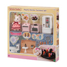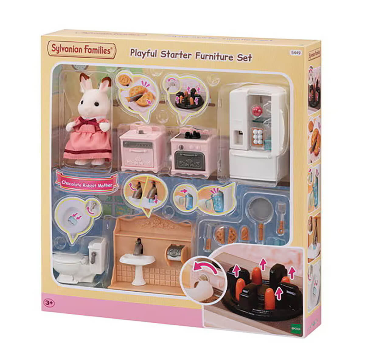 Playful Starter Furniture Set by Sylvanian Families. The perfect starter set for any Sylvanian Families home. This 27 piece interactive set has moveable parts for added realism. Turn the hob on to reveal a flame, cut the foods with a knife, flush the toilet for 'water' and turn on the taps.