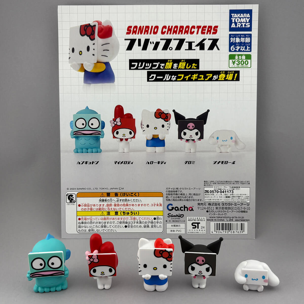 Sanrio Characters Flip Face Gachapon Capsule Collectible by Takara Tomy. Highly collectible and authentic Japanese gachapon capsule containing one of five different Sanrio characters hiding their faces with a flip image of themselves.