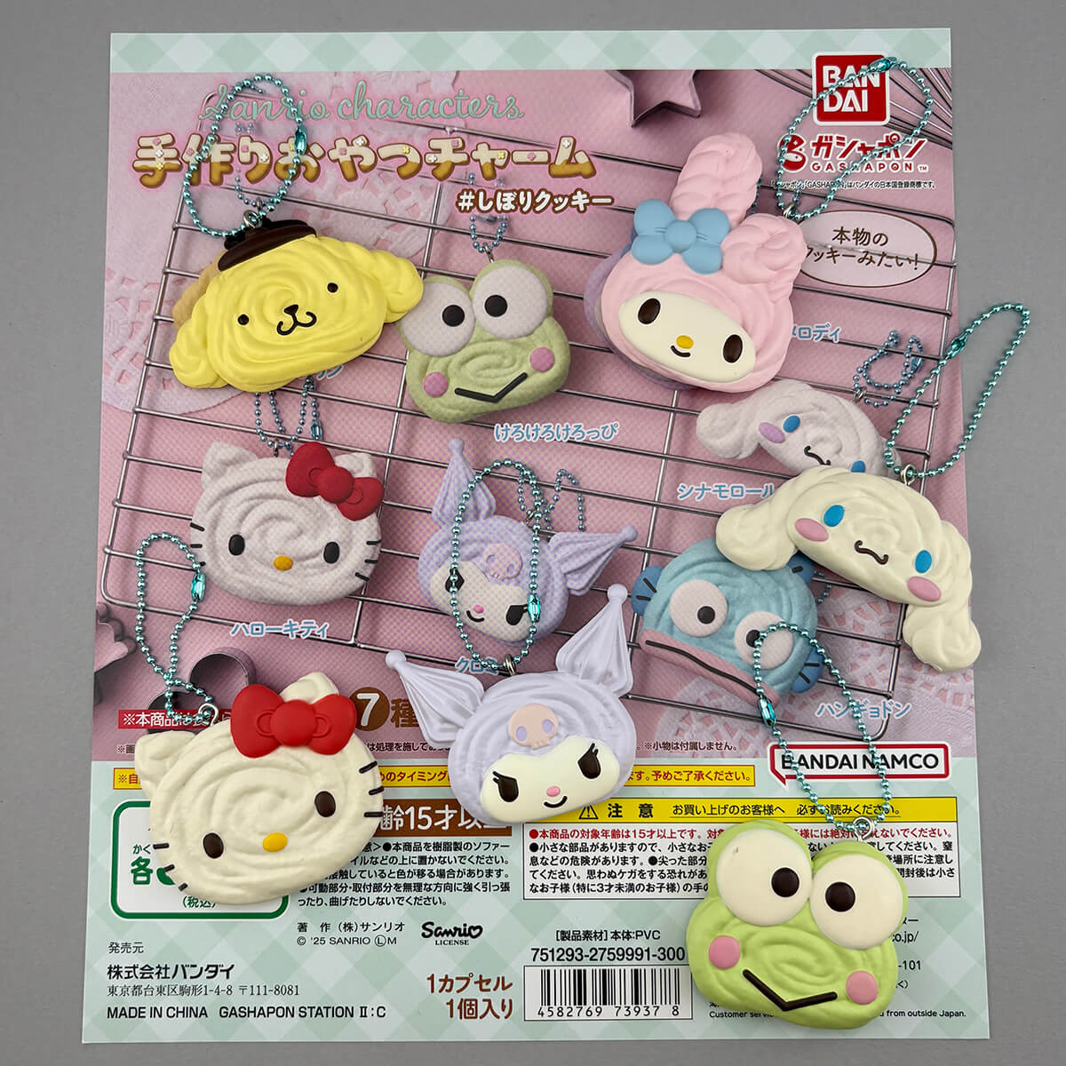 There are seven sweet Sanrio cookie characters in this Gachapon series: Pompompurin, Keroppi, My Melody, Cinnamoroll, Hello Kitty, Kuromi and Hangyodon.