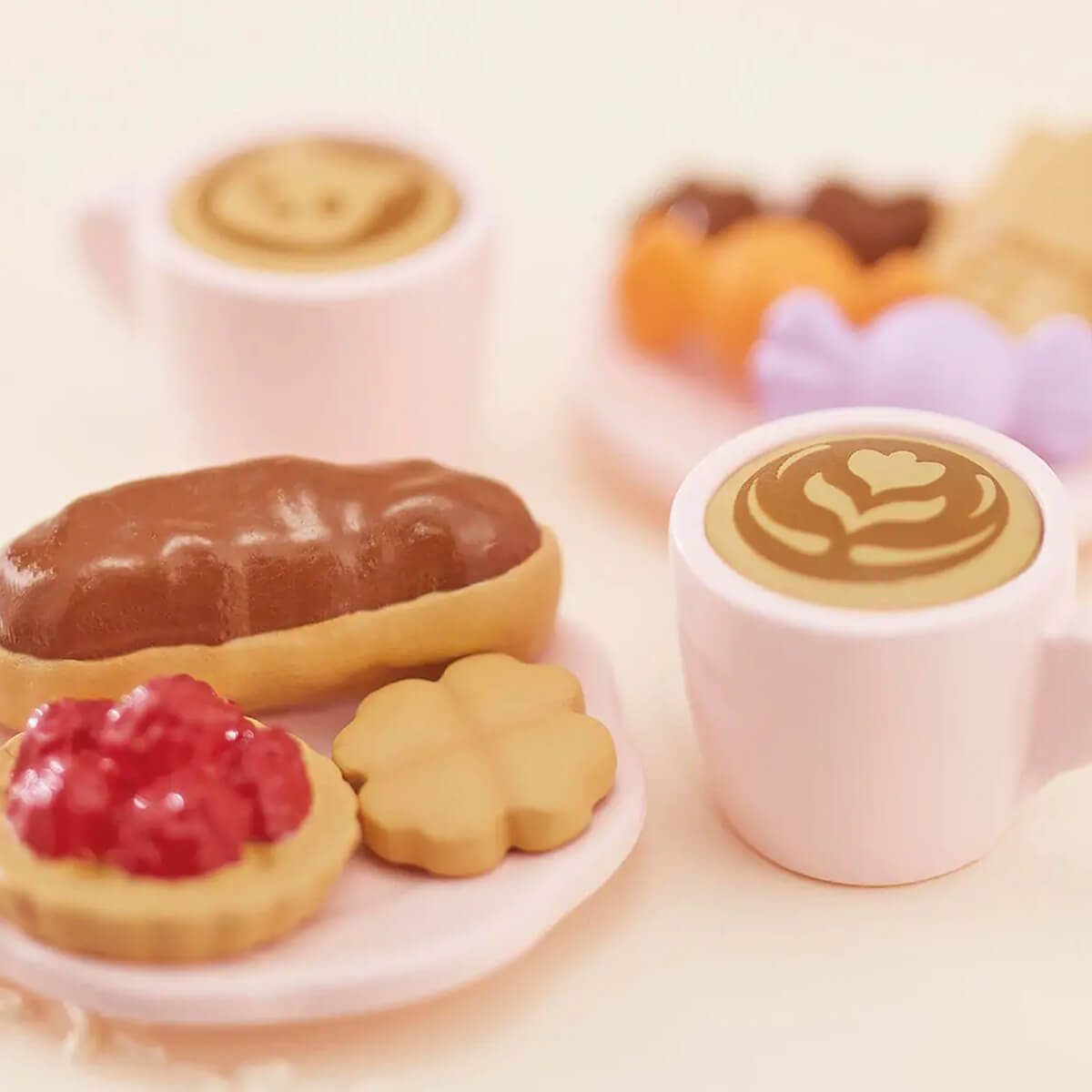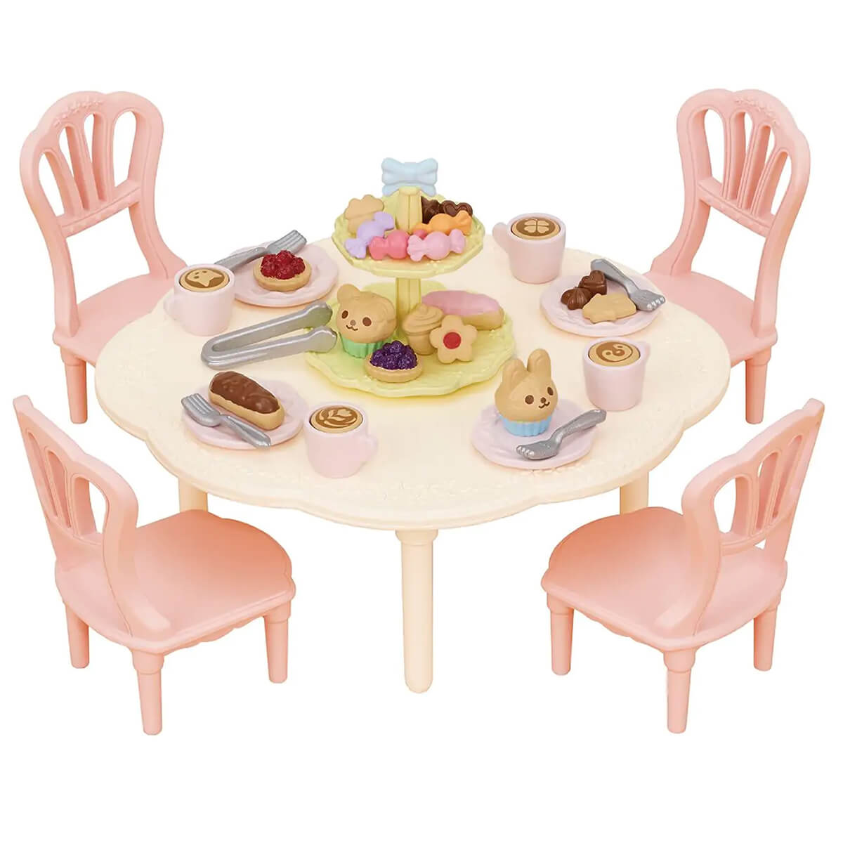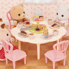 Sweets Party Set by Sylvanian Families. Organise a lovely party with this adorable furniture set! Featuring a colourful table and matching chairs, coffee, cakes, and other sweet treats. Furniture set featuring colourful table and chairs, with coffee, cakes, and other sweet treats. Contains a total of 30 teatime accessories. Includes a selection of sweet treats and four different kinds of latte art. The cake stand can be used to display the cakes and sweets.